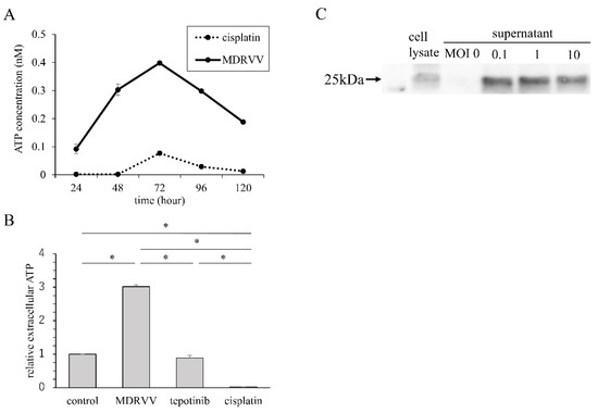 Increase in molecules associated with immunogenic cell death in A549 cells. (A) Time course of ATP concentration. Cells were cultured with MDRVV or cisplatin, and ATP concentrations in the supernatant were measured daily. (B) ATP concentrations in the supernatant compared to control after 72 h of exposure with MDRVV, tepotinib, or cisplatin. * p < 0.05 compared to each agent. (C) HMGB-1 expression. Cells were cultured for MDRVV for 3 days, and cell lysate and supernatant were collected. HMGB-1 expression was assessed using Western blotting.