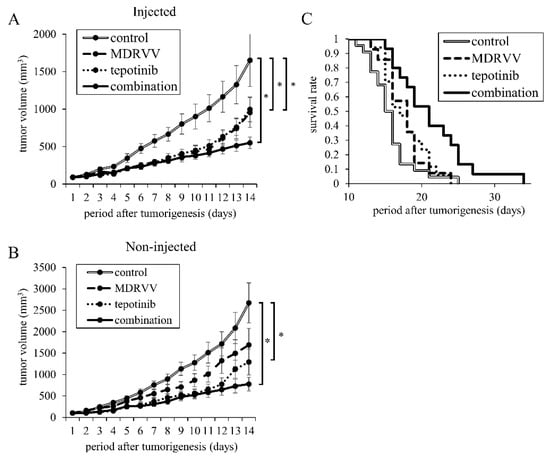 Effects of MDRVV and tepotinib on tumor progression and survival in mice. 3LL cells were subcutaneously inoculated in two sites per mouse. After tumorigenesis, MDRVV were injected into one tumor. Tepotinib was administered intraperitoneally. (A,B) The volumes of (A) MDRVV-injected tumor and (B) MDRVV-non-injected tumor. The number of mice used was 10 for the combination group and 9 for the other groups. * p < 0.05 for comparison of both groups. (C) Kaplan–Meier curves for survival in four groups. When the tumor volume exceeded 2250 cubic millimeters, which is approximately 10% of the body weight, mice were euthanized. The number of mice used was 22, 14, 17, and 15 in the control, MDRVV, tepotinib, and combination groups, respectively. The combination group survived significantly longer than all groups (p < 0.05).
