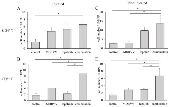 Tumor-infiltrating lymphocytes. Tumors were resected from euthanized mice, as shown in Figure 3C, and immunostainings for CD4 and CD8 were performed. (A,B) MDRVV-injected tumors. (C,D) MDRVV-non-injected tumors. (A,C) CD4-positive T-cells. (B,D) CD8-positive T-cells. * p < 0.05 for comparison of both groups.