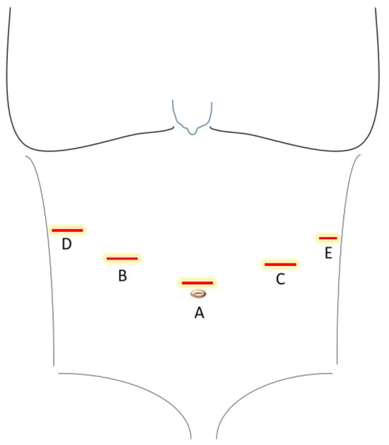 Figure 1. Trocar placement for laparoscopic gastrectomy with pouch reconstruction. A. Camera port (12 mm). B. and C. Operator trocars (12 mm). D. Liver paddle trocar (12 mm). E. Assistant trocar (5 mm). - Mobilization of the greater omentum from the transverse colon.