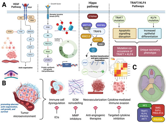 Integrated Molecular, Spatial, and Microenvironmental Framework of Meningioma Pathogenesis and Therapeutic Vulnerabilities. (A) Key molecular alterations implicated in meningioma tumorigenesis. Left: Dysregulation of VEGF/MAPK and PI3K/mTOR pathways driven by upstream mutations in NF2 or TRAF7-related gene networks as well as KLF4 mutation pathways, aiding in increased epithelial differentiation, promoting aberrant actin organization, cell growth, and survival. Right: Epigenetic dysregulation (histone modifications), telomerase reactivation via TERT promoter mutations, and CDKN2A/B deletions contribute to cell cycle progression and immortalization. (B) Hallmarks of the meningioma tumor microenvironment and associated therapeutic targets. These include immune cell dysregulation (targeted via immune checkpoint inhibitors), ECM remodeling (addressed with MMP inhibitors), angiogenesis (treated with anti-angiogenic therapies), and cytokine-mediated immune evasion (targetable through cytokine blockade). (C) Spatial distribution of driver mutations in meningiomas mapped across embryologically distinct meningeal regions. NF2 alterations predominate in the posterior and lateral skull base (green), while mutations in TRAF7, KLF4, AKT1, and POLR2A localize more anteriorly (red and yellow), reflecting embryologic origins and site-specific tumor biology. Created with BioRender.com.