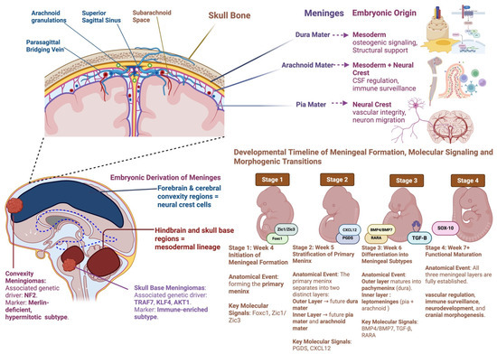 One way to better understand meningioma tumorigenesis is to examine the development of the meninges. Until recently, the meningeal layers were viewed merely as specialized membranes surrounding brain tissue, serving a purely protective role [13]. However, increasing evidence suggests otherwise. Meninges are not mere barriers; they orchestrate critical phases of development, provide essential contributions to neurogenesis, and influence the neuroimmunological environment [13,14,15]. Additionally, the meninges are critical in developing the blood–brain barrier (BBB), an essential component of the relative immune privilege of the brain [16]. Recent data suggest that the meninges directly affect brain and calvarial bone development [14,15,17,18,19]. Dysfunctions in the meninges have been linked to cranial deformation and neuro-developmental disorders, including Dandy-Walker malformations and cobblestone lissencephaly [13,15]. Meningeal development begins in the first trimester, when the meningeal layers are highly responsive to environmental stimuli and genetic control, making them most vulnerable to developmental disruptions and epigenetic alterations that can result in structural malformations and future tumor susceptibility [18].