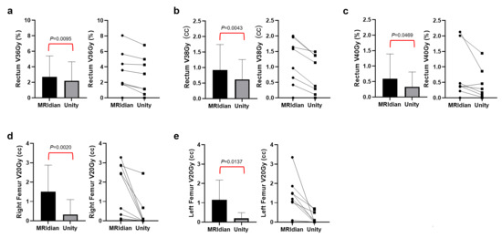Prostate OAR Dose Comparison between the MRIdian and Unity Systems. Lower rectum V36Gy (a), V38Gy (b), V40Gy (c), as well as right (d) and left (e) femur V20Gy, were observed with Unity compared to MRIdian. The difference reached statistical significance. Ladder plots were displayed in the figure to demonstrate the paired OAR dose comparison between the two systems of each individual case.