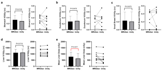 Critical mucosal tissue dose comparison between the MRIdian and Unity systems. The dose comparison in the stomach (a), duodenum (b), small bowel (c), V33Gy, and liver V15Gy (d) revealed no significant difference between Unity and MRIdian. Interestingly, in some cases, Unity also demonstrated a relatively large positive or negative dose difference from the MRIdian equivalents in comparison to that of the prostate plans, despite the lack of statistical significance in general, which may reflect the variation in optimization strategies employed by different planners when addressing complex treatments like those in the pancreas patients. Lower mean liver dose was observed with Unity when compared to MRIdian (e).