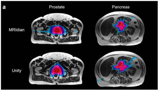 There are several limitations in this study. First, the MRIdian and the Unity plans of the same patient were created by different planners. The clinical MRIdian treatments were generated by board-certified dosimetrists and/or physicists, whereas the Unity counterparts were planned by resident physicists after a short course of Monaco TPS training. To account for the difference in planning experience, Unity plans were supervised by three board-certified medical physicists with expertise in MRgRT planning on MRIdian (J.L. and X.Q.) and Unity (D.H.) platforms. Second, the clinical plans were produced under a typical turnaround time of seven days, while no explicit time constraint was imposed when creating the Unity counterparts. Additionally, the plan quality reports of the MRIdian plans were not blinded to the Unity planners, and thus, what each plan could potentially achieve dosimetrically was known to the Unity planners a priori. This knowledge may have guided the approach to generating Unity plans by setting a benchmark, partially contributing to the similar dosimetric performance observed between the two platforms. On the other hand, similar planning parameters were maintained for both systems during the plan optimization. These parameters were optimized for the MRIdian system and, thus, may not fully leverage the capabilities of the Monaco TPS and Unity platform. Nevertheless, the key question investigated in this work was whether the Unity system would yield comparable plans to those of the MRIdian system in the two aforementioned trials [15,20]. Our study successfully demonstrated similar dosimetric performance between the two systems despite the different system designs. Secondly, we only investigated the initial reference treatment plans for each patient. No comparison was made for any treatment adaptations. Hence, the different dosimetric performance of online adaptation remains a question that should be studied in future work. In addition, it is also important to note that motion management during treatment delivery can play a critical role in the final dose received by the targets and OARs. For example, the allowed number and orientation of imaging planes, achievable spatial and temporal resolution, as well as the possibility of beam trailing for baseline motion correction, are different between the MRIdian and Unity motion management systems [31,32,33]. These different gating techniques and motion mitigation strategies can influence the precision of radiation dose delivery to the target while minimizing exposure to the surrounding OARs. Although the differences do not affect the dosimetric characteristics of the initial reference plan and, therefore, do not impact the findings of this study, they may alter the actual dose received by the patients during the treatment, potentially influencing clinical endpoints. Finally, this is a retrospective study with a limited number of patients, potentially limiting the statistical power. Moreover, only prostate and pancreas treatments have been investigated in this work. Evaluation across additional anatomical sites with daily anatomical variation using a larger sample size and clinical endpoints could provide deeper insights into the unique advantages and challenges of each system, and should be studied in the future work.