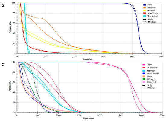 For pancreas patients, no significant dose difference was observed for the OARs except for the liver when comparing Unity to MRIdian. The Unity treatments had significantly lower mean liver dose (trial goal: ≤20 Gy, difference: 1.40 Gy, p = 0.0371). Figure 2 demonstrates the dosimetric comparisons between the two systems in critical mucosal tissues near the treatment target.
