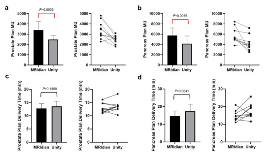 Figure 4a,b demonstrates the number of monitor units between the MRIdian and Unity plans. The mean number of MUs of the prostate treatments was 3398 ± 791 and 2478 ± 372 for MRIdian and Unity, respectively. The mean number of MUs of the pancreas treatments was 5758 ± 1375 and 4142 ± 1423 for MRIdian and Unity, respectively. Unity used a smaller number of MUs compared to MRIdian for both prostate (difference = 920 MUs, p = 0.0036) and pancreas (difference = 1616 MUs, p = 0.0076). Figure 4c,d compares the treatment delivery time between the MRIdian and Unity systems. The mean delivery time for prostate treatments was 12.78 ± 1.68 (TPS-estimated) and 13.53 ± 1.88 (measured) minutes for MRIdian and Unity, respectively. The mean delivery time for pancreas treatments was 14.58 ± 2.78 (TPS-estimated) and 17.40 ± 3.77 (measured) minutes for MRIdian and Unity, respectively.
