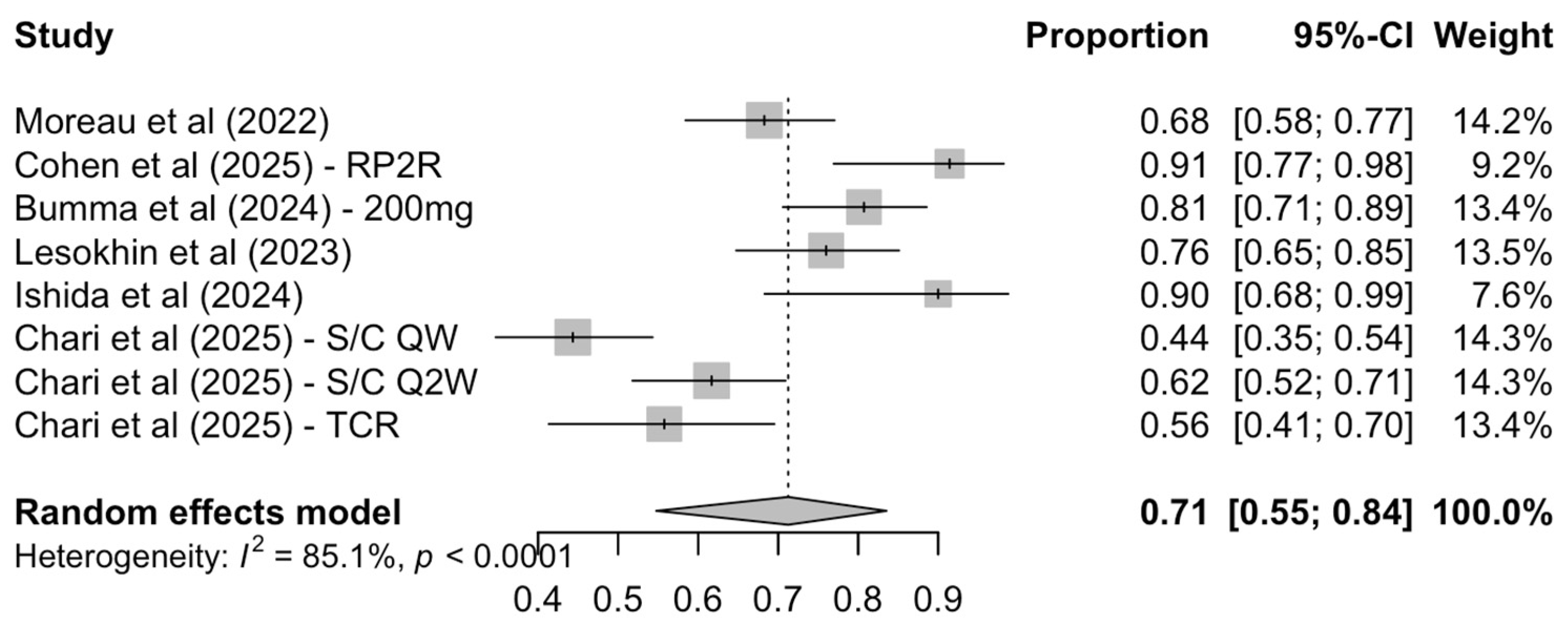 | MonumenTAL-1 (S/C QW arm) Chari et al., (2025) [28] | Ia/Ib | GPRC5D × CD3 | talquetamab | 143 | 25.60 | 67.00 | 5.00 | 107 (74.8) |
