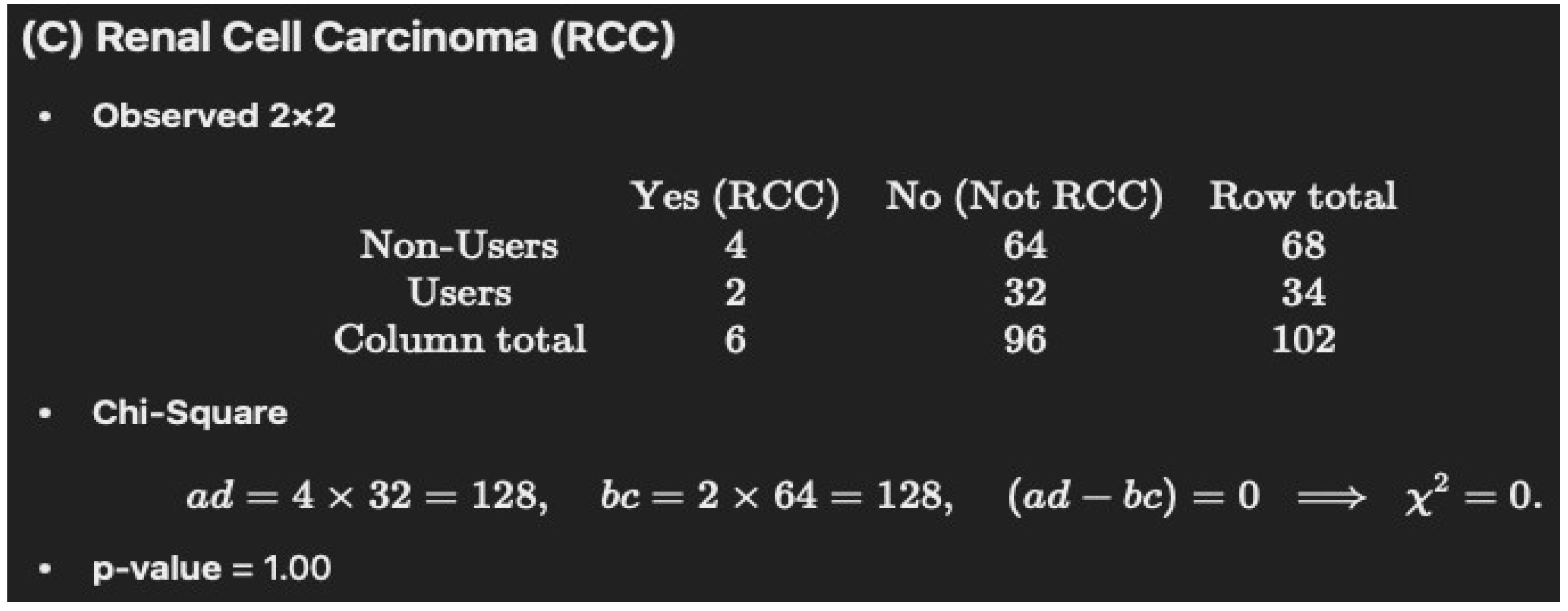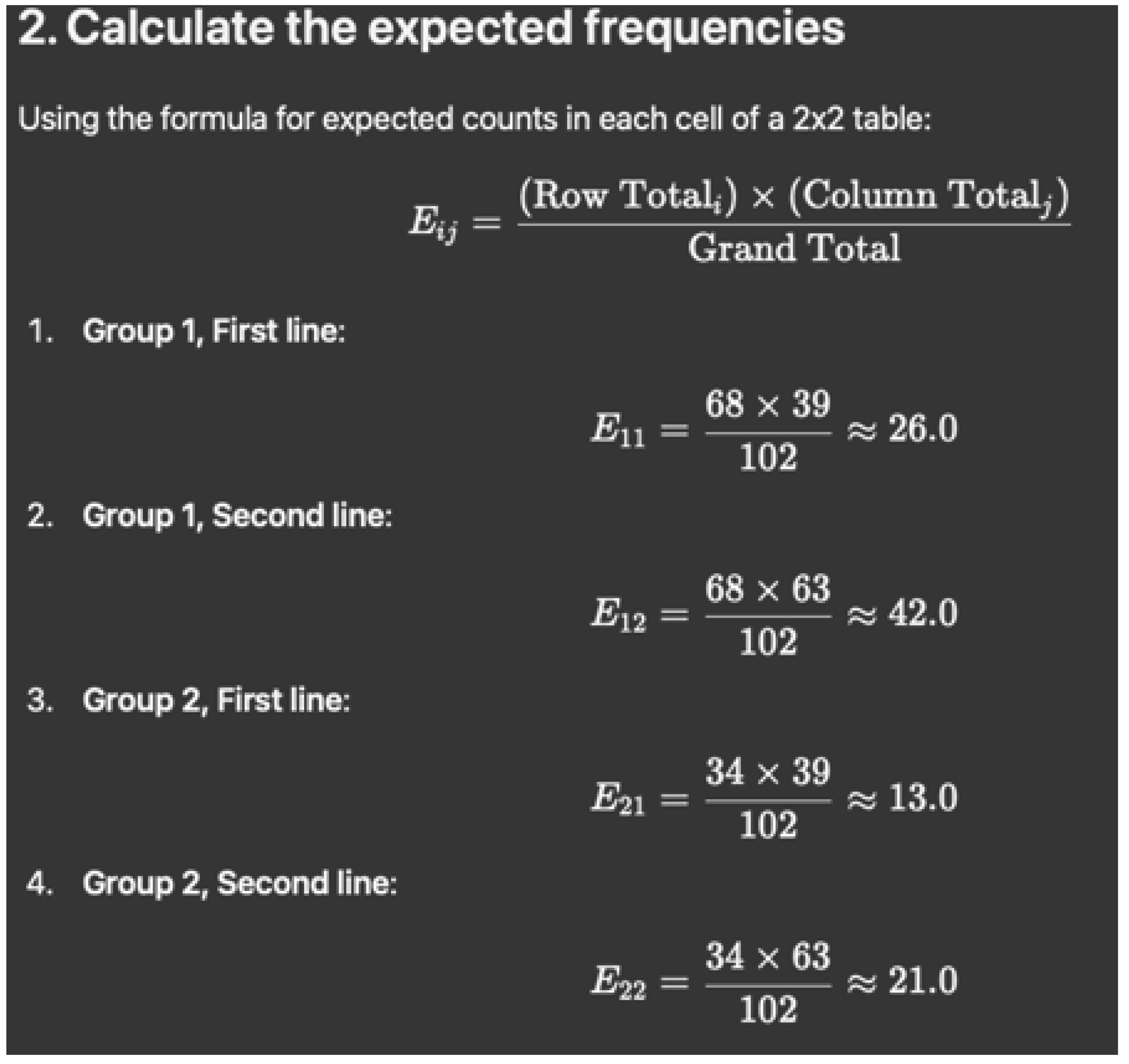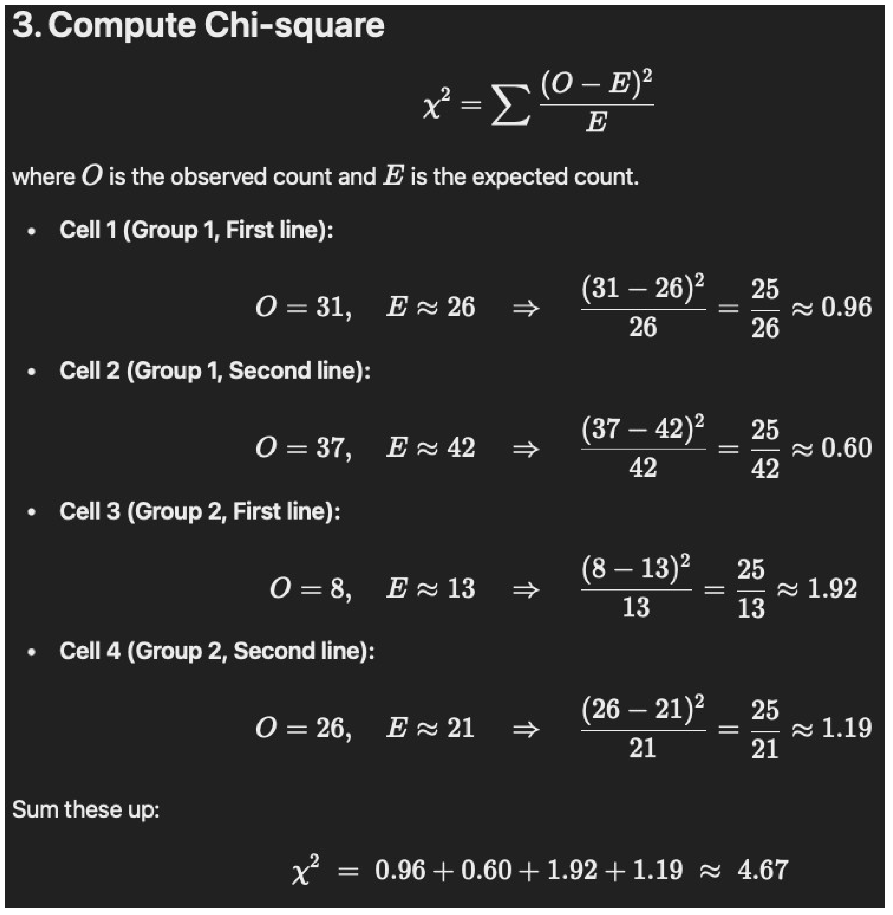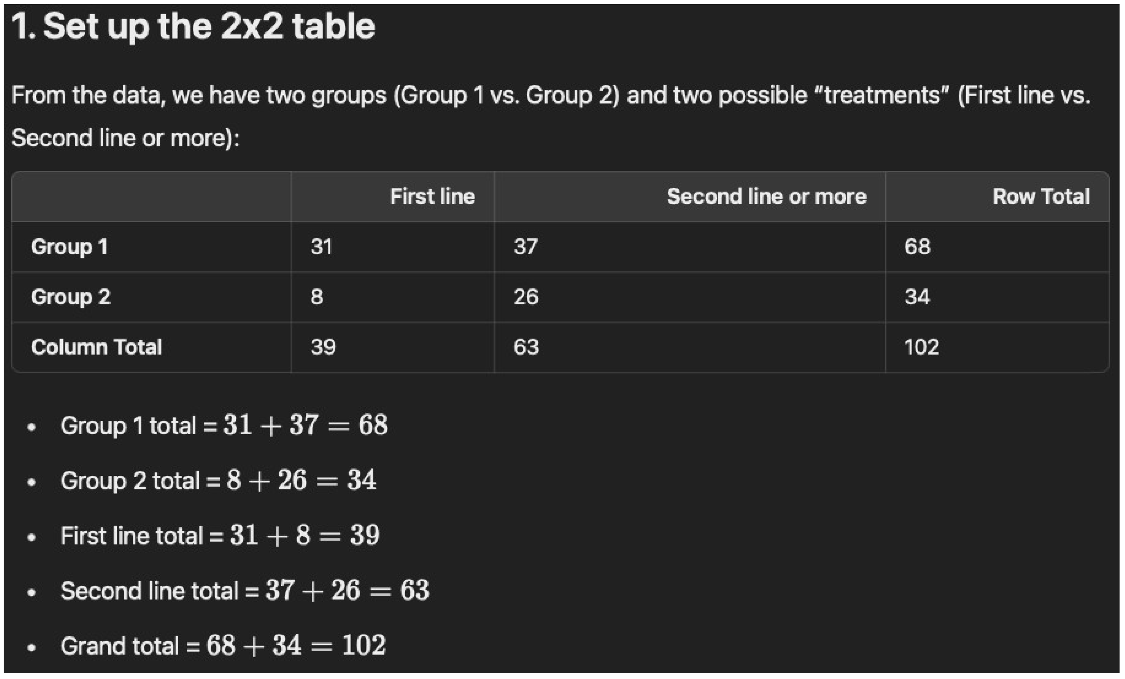 Below is a step-by-step walkthrough of calculating a Chi-square (\(\chi^2\)) test from the table: --- ## 1. Set up the 2 × 2 table From the data, we have two groups (Group 1 vs. Group 2) and two possible “treatments” (First line vs. Second line or more): | | First line | Second line or more | Row Total | |----------------------|-----------:|---------------------:|----------:| | **Group 1** | 31 | 37 | 68 | | **Group 2** | 8 | 26 | 34 | | **Column Total** | 39 | 63 | 102 | - Group 1 total = \(31 + 37 = 68\) - Group 2 total = \(8 + 26 = 34\) - First line total = \(31 + 8 = 39\) - Second line total = \(37 + 26 = 63\) - Grand total = \(68 + 34 = 102\) --- ## 2. Calculate the expected frequen-cies Using the formula for expected counts in each cell of a 2 × 2 table: \[ E_{ij} = \frac{(\text{Row Total}_i) \times (\text{Column Total}_j)}{\text{Grand Total}} \] 1. **Group 1, First line**: \[ E_{11} = \frac{68 \times 39}{102} \approx 26.0 \] 2. **Group 1, Second line**: \[ E_{12} = \frac{68 \times 63}{102} \approx 42.0 \] 3. **Group 2, First line**: \[ E_{21} = \frac{34 \times 39}{102} \approx 13.0 \] 4. **Group 2, Second line**: \[ E_{22} = \frac{34 \times 63}{102} \approx 21.0 \] --- ## 3. Compute Chi-square \[ \chi^2 = \sum \frac{(O - E)^2}{E} \] where \(O\) is the observed count and \(E\) is the expected count. - **Cell 1 (Group 1, First line):** \[ O = 31, \quad E \approx 26 \quad \Rightarrow \quad \frac{(31 - 26)^2}{26} = \frac{25}{26} \approx 0.96 \] - **Cell 2 (Group 1, Second line):** \[ O = 37, \quad E \approx 42 \quad \Rightarrow \quad \frac{(37 - 42)^2}{42} = \frac{25}{42} \approx 0.60 \] - **Cell 3 (Group 2, First line):** \[ O = 8, \quad E \approx 13 \quad \Rightarrow \quad \frac{(8 - 13)^2}{13} = \frac{25}{13} \approx 1.92 \] - **Cell 4 (Group 2, Second line):** \[ O = 26, \quad E \approx 21 \quad \Rightarrow \quad \frac{(26 - 21)^2}{21} = \frac{25}{21} \approx 1.19 \] Sum these up: \[ \chi^2 \;=\; 0.96 + 0.60 + 1.92 + 1.19 \;\approx\; 4.67 \] --- ## 4. Determine degrees of freedom (df) and ap-proximate p-value For a 2 × 2 contingency table, \[ \text{df} = (2–1) \times (2–1) = 1. \] With \(\chi^2 \approx 4.67\) and \( \text{df} = 1\): - The p-value is between 0.025 and 0.05 (since \(\chi^2 = 3.84\) corresponds roughly to p = 0.05 and \(\chi^2 = 5.02\) to p = 0.025). - More precisely, it is around **p ≈ 0.03**. --- ## 5. Conclusion **\(\chi^2 \approx 4.67\) with df = 1, and \(p \approx 0.03\).** Thus, there is a statistically significant (though borderline) difference between the two groups regarding whether immunotherapy is given as first line vs. second line or more. --- *Hope this helps, Dr. Dobbins!*