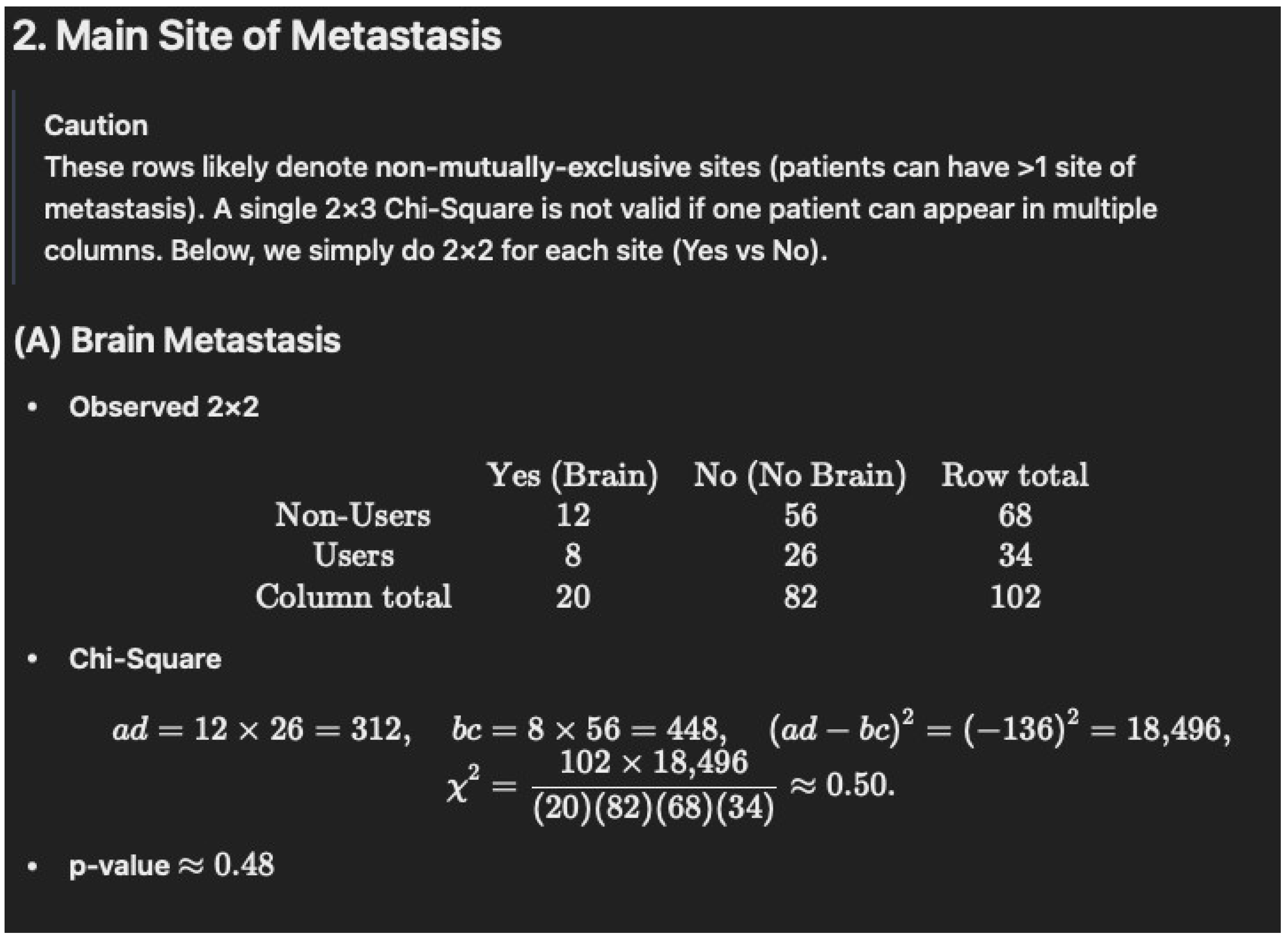 - The model found an error in the table where it marks the brain as the main site of metastasis, where Users (N = 34): 8/34 = 23.5%. The original table lists 13.2% for 8/34, which is incorrect.