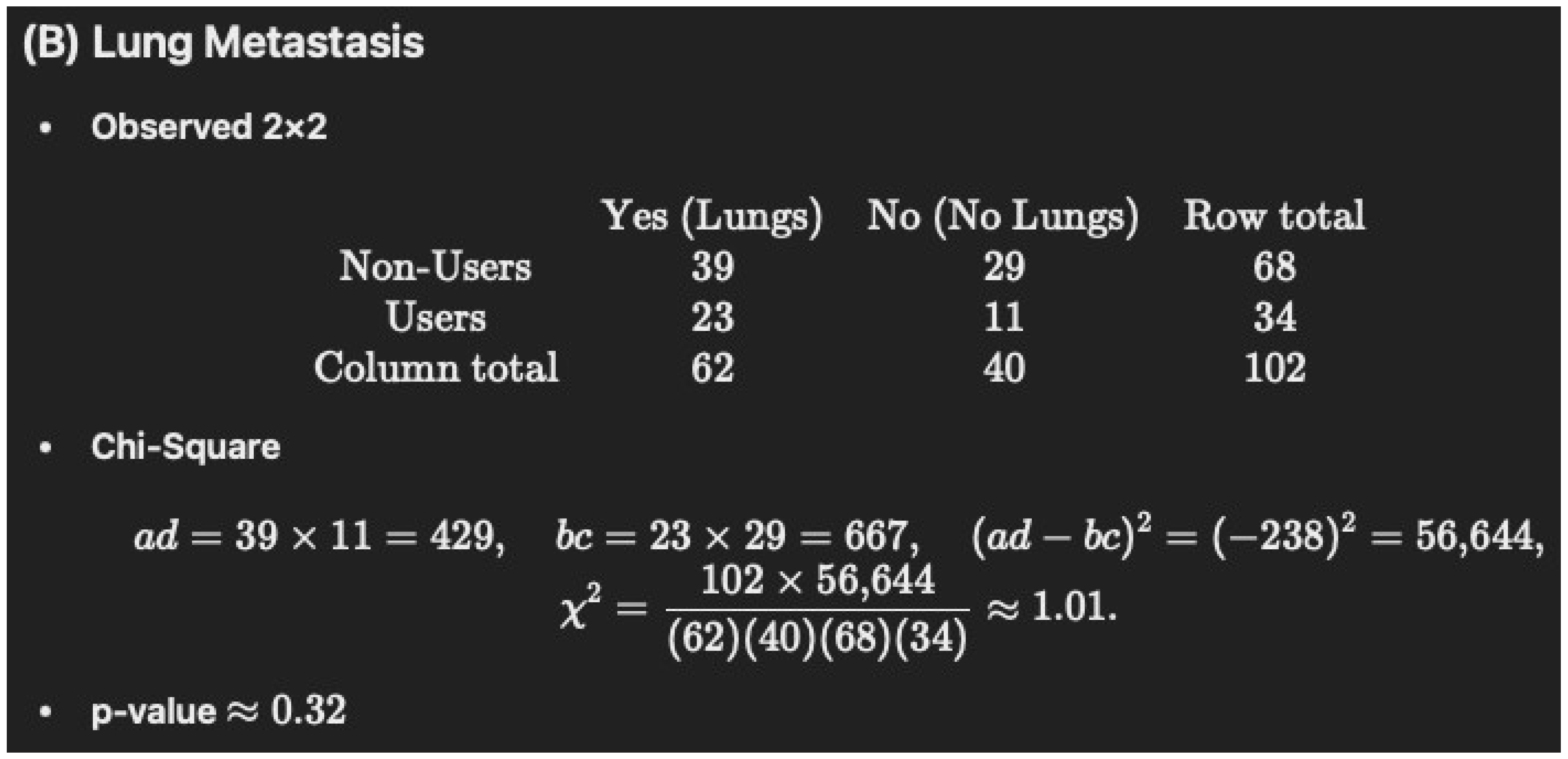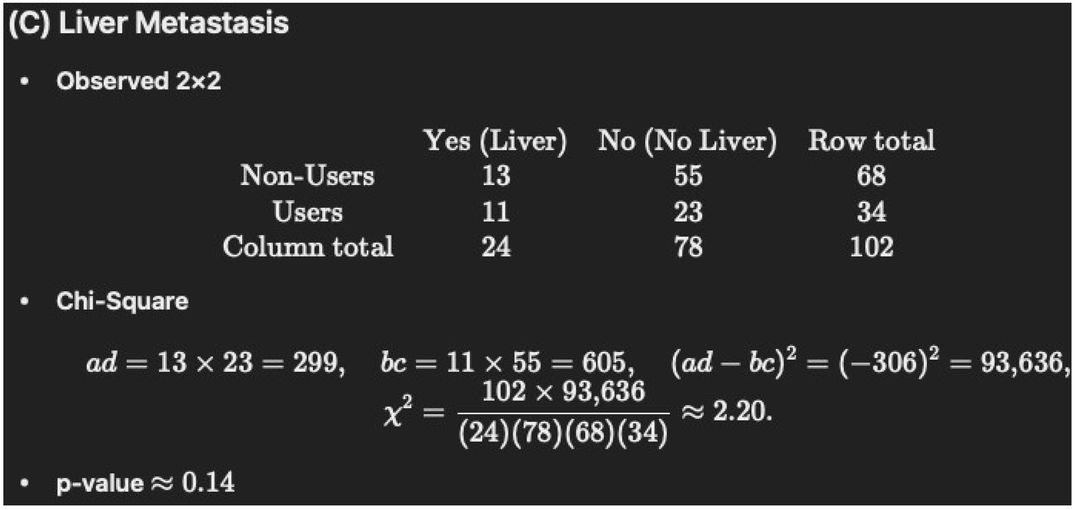 - Table 1 and the associated text is the foundation of this report [1]. If this baseline information is inaccurate and the groups differ significantly on other variables besides cannabis, then it becomes very challenging to meaningfully assess the rest of this study. They reported (page 3, Section 2.1) that liver metastasis of the immunotherapy group (19% of N = 68 is 13) vs. the immunotherapy–cannabis group (67% of N = 34 is 23) had a p = 0.89. Using GraphPad Prism [7] and the two statistics listed in their Methods section (chi-square and Fisher’s exact tests) with the N provided, we were unable to verify this result. We determined that chi-square (1) = 23.375, p < 0.0001 and Fisher’s p < 0.0001.