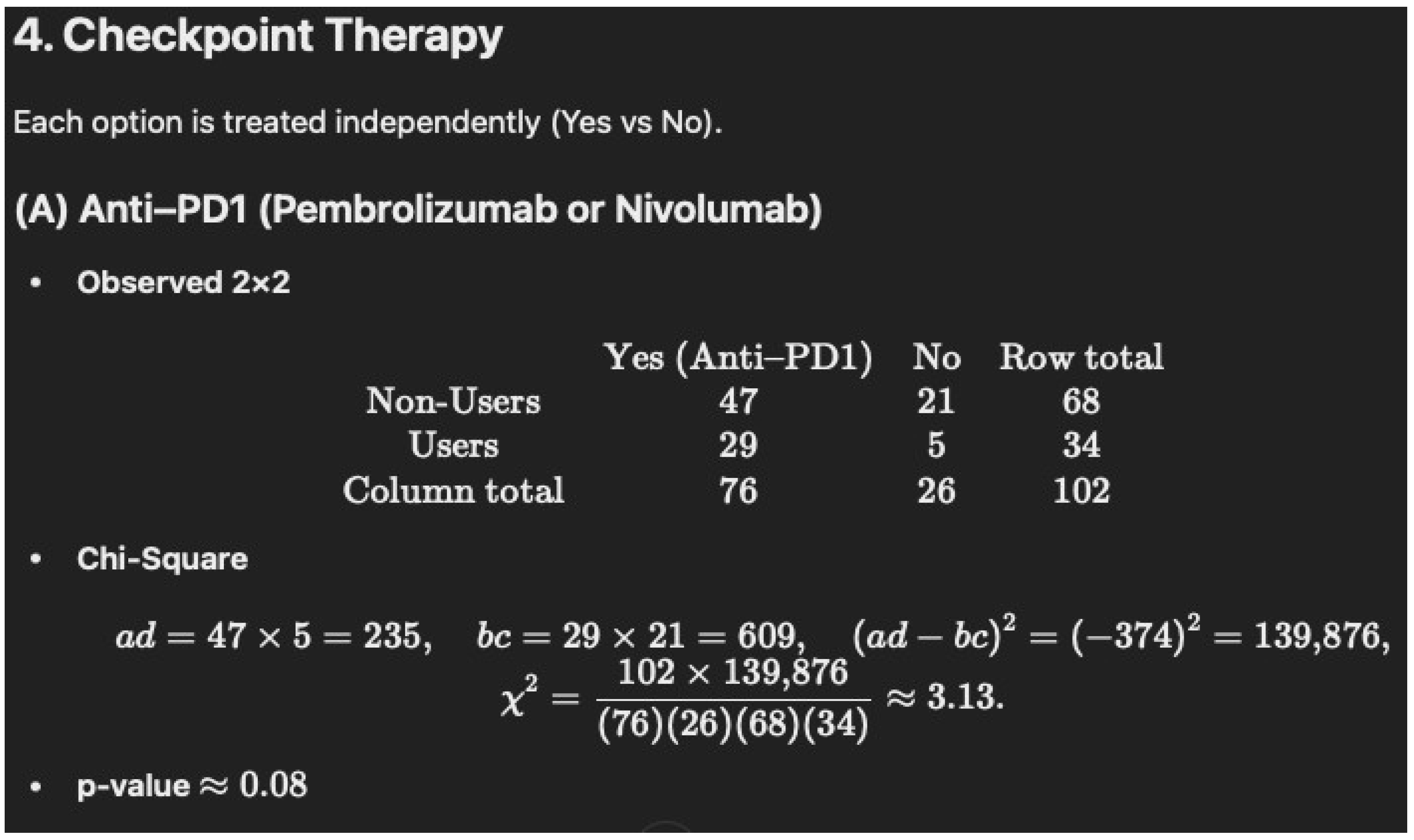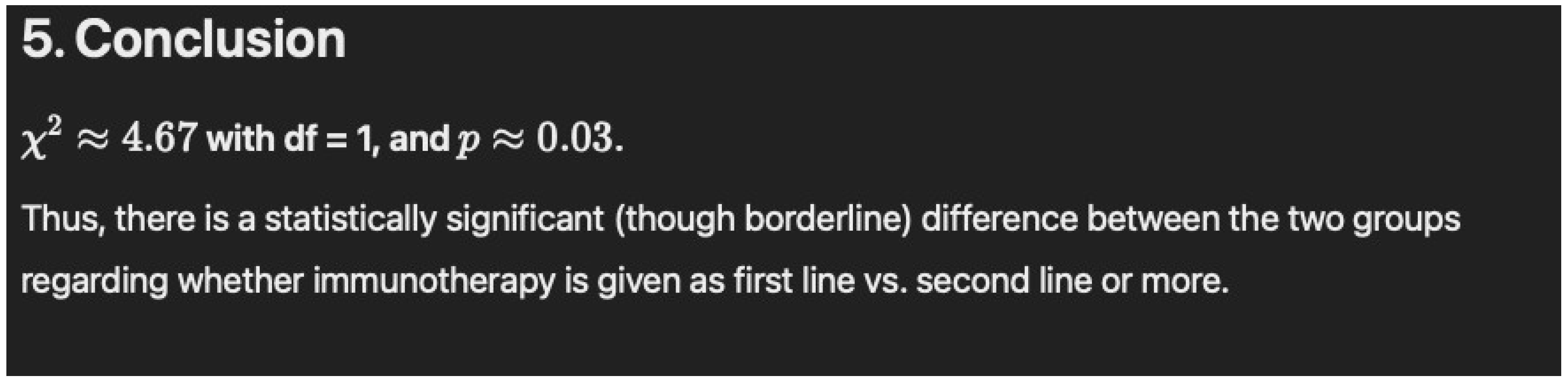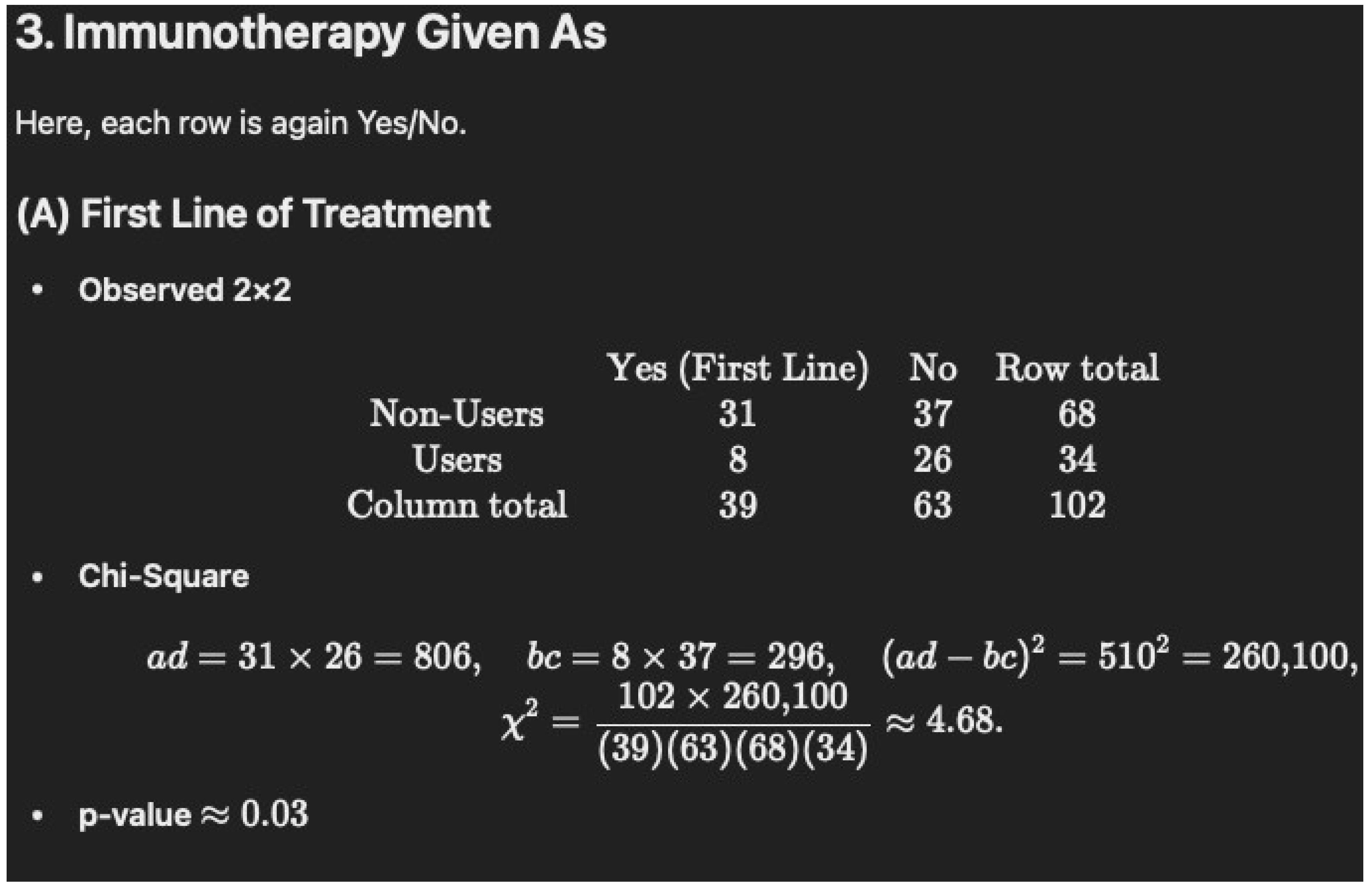 - Then, we instructed the model to now perform the same test for Table 1. Cont., with immunotherapy given as the first-line vs. second-line treatment. The 4o model produced a p-value of 0.0518, which matched that in the paper, likely due to bias. We found this to be inaccurate so we input the data into the o1 model (much better at statistics) and instructed it to perform the same task. See # 2.