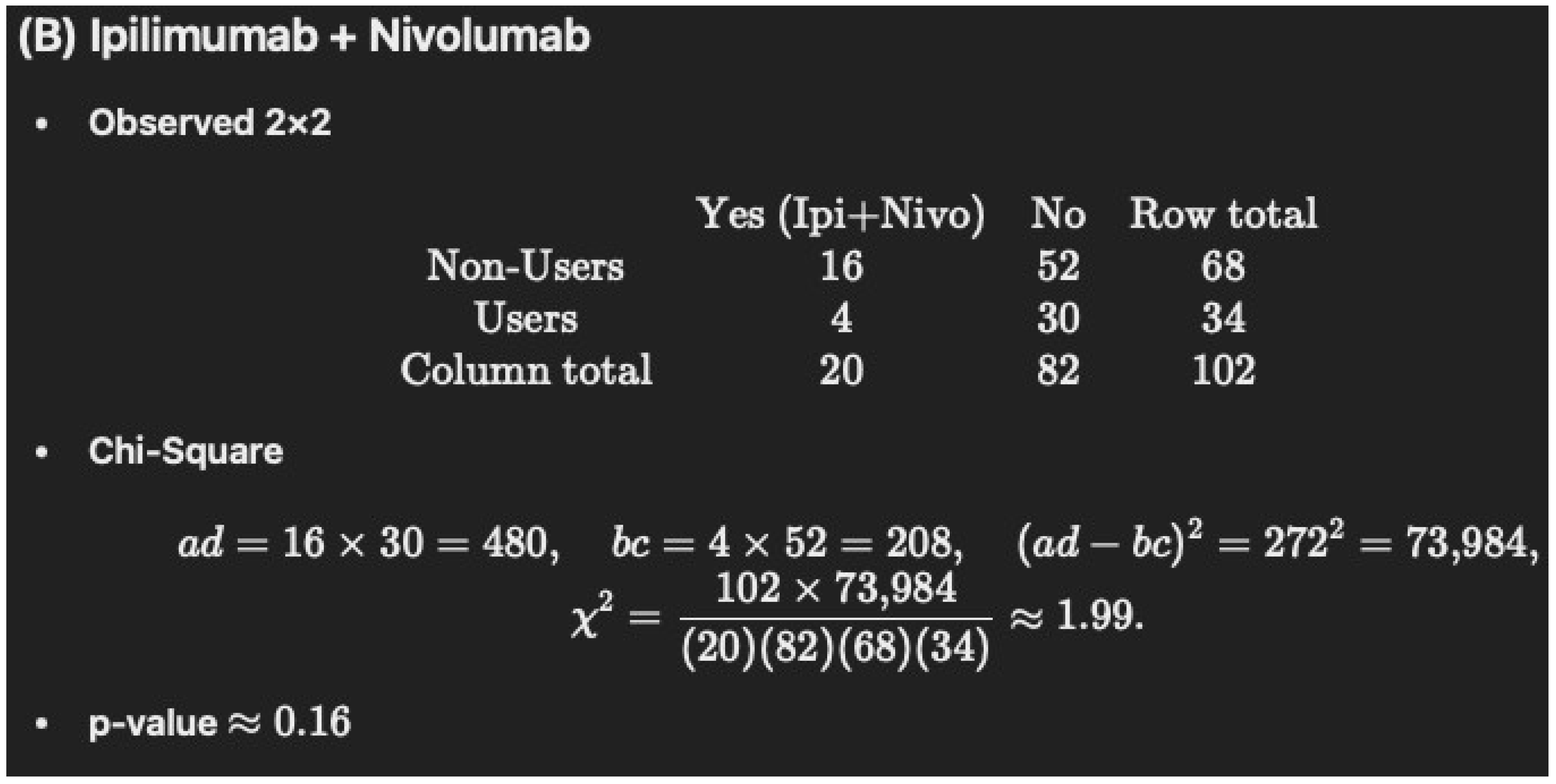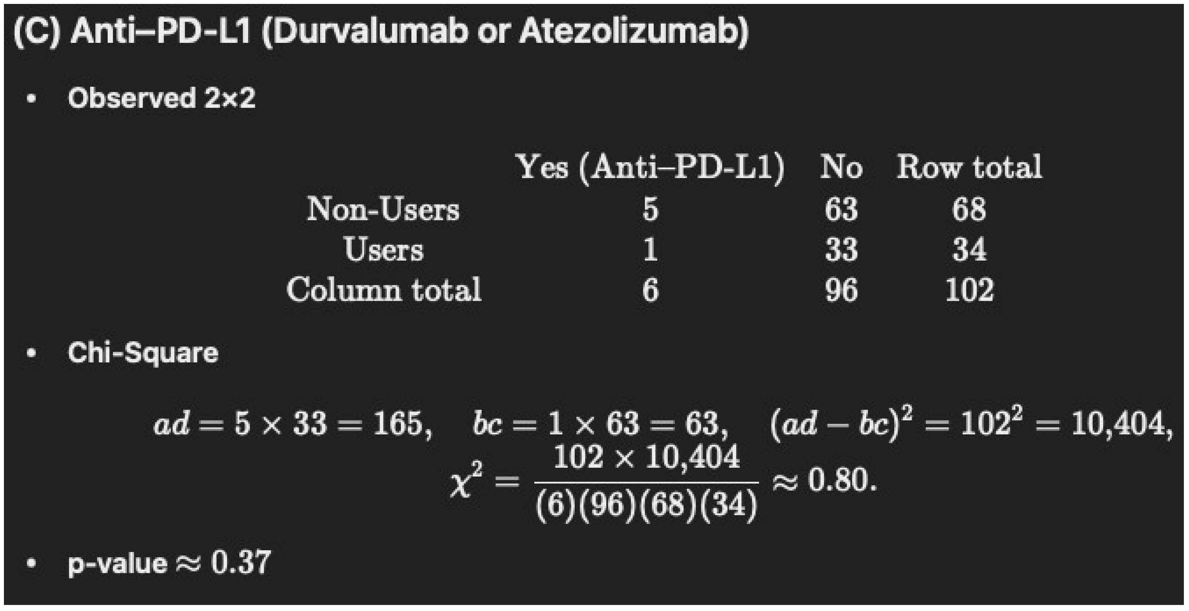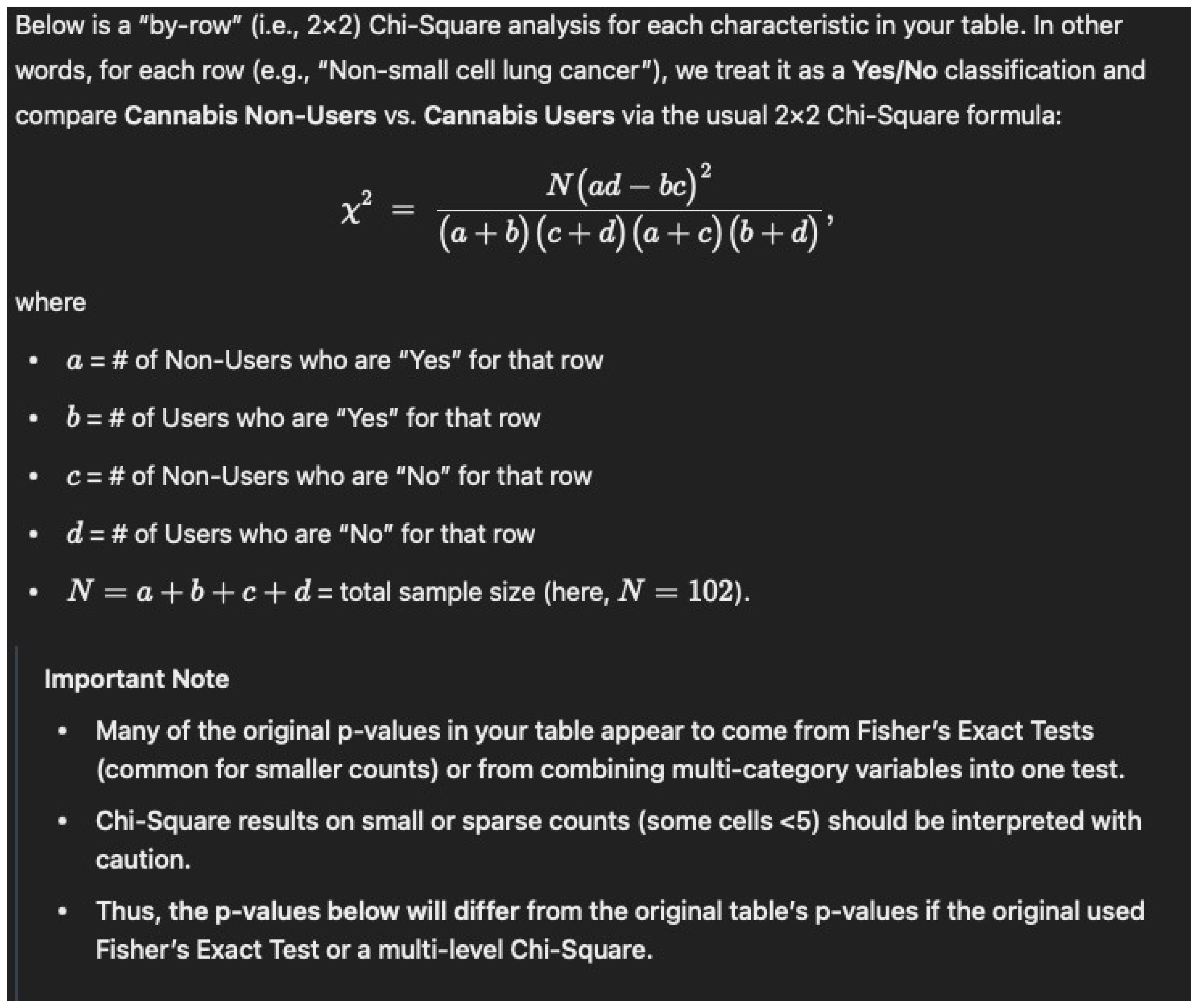 - Table 1 notes that 76% of the immunotherapy–cannabis group (76% of N = 34 is 26) were given immunotherapy as the second line of treatment versus 54% (54% of N = 68 is 37) of immunotherapy only, which had a p-value of “0.05178”. Again, we were unable to verify this with chi-square (1) = 4.67, p = 0.0317 and Fisher’s p = 0.0334.