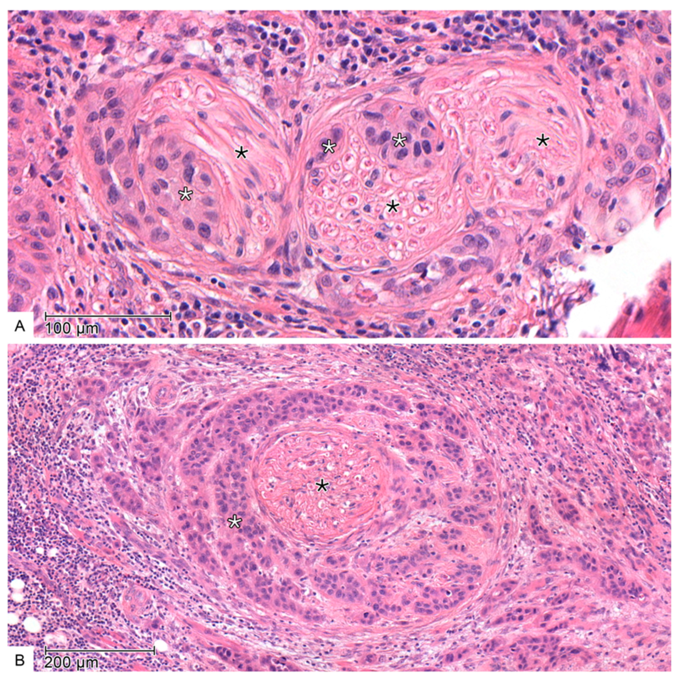- Yang, X.; Tian, X.; Wu, K.; Liu, W.; Li, S.; Zhang, Z.; Zhang, C. Prognostic impact of perineural invasion in early stage oral tongue squamous cell carcinoma: Results from a prospective randomized trial. Surg. Oncol. 2018, 27, 123–128. [Google Scholar] [CrossRef]