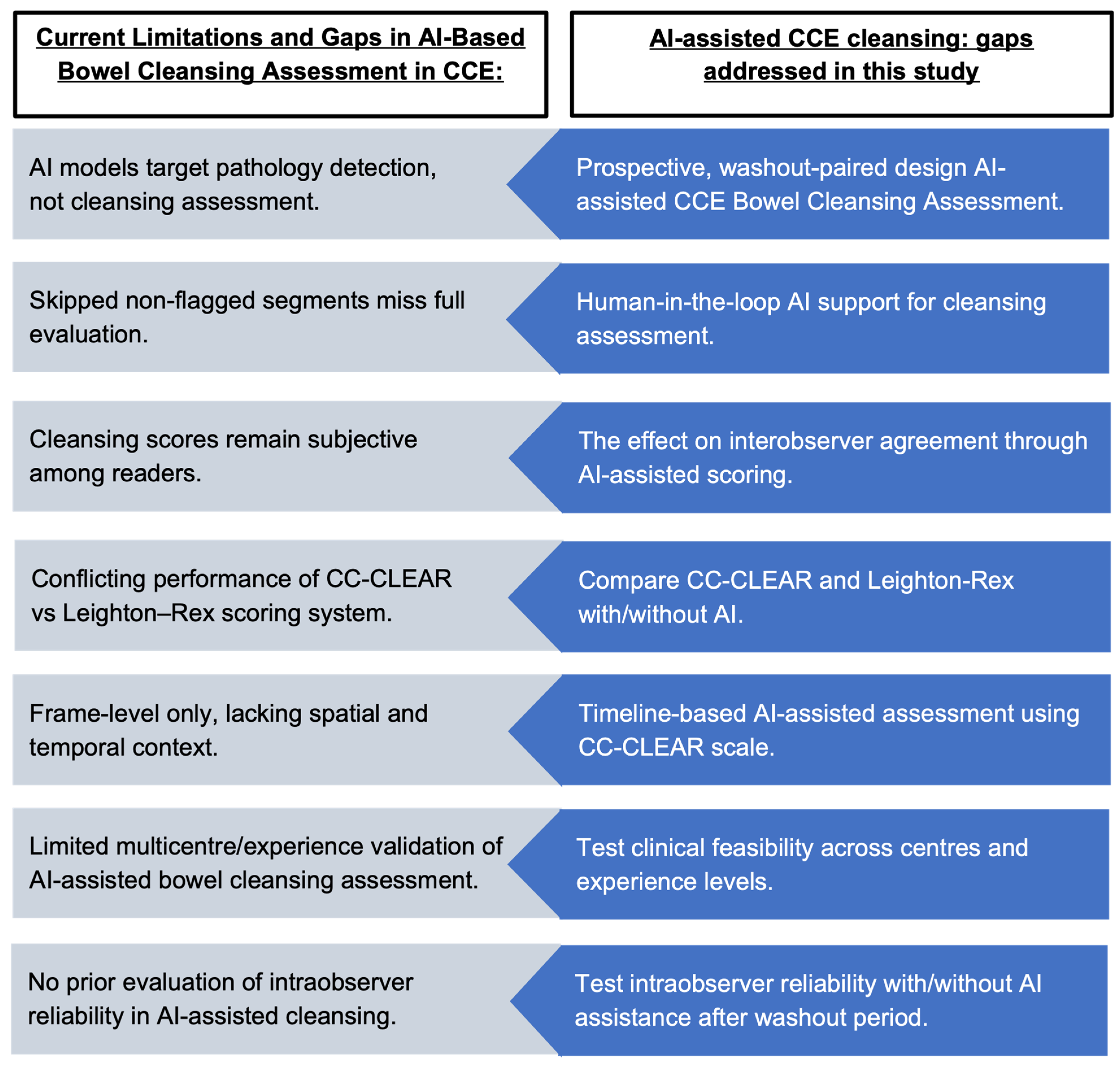 Figure 1 summarises the current limitations in bowel cleansing assessment for CCE and outlines the objectives of this study in addressing those gaps. This prospective, multi-reader, washout-paired evaluation tests a hybrid human-in-the-loop AI-assisted bowel cleansing assessment tailored to CCE, rather than small bowel extrapolations, directly addressing standardisation and reproducibility at scale.