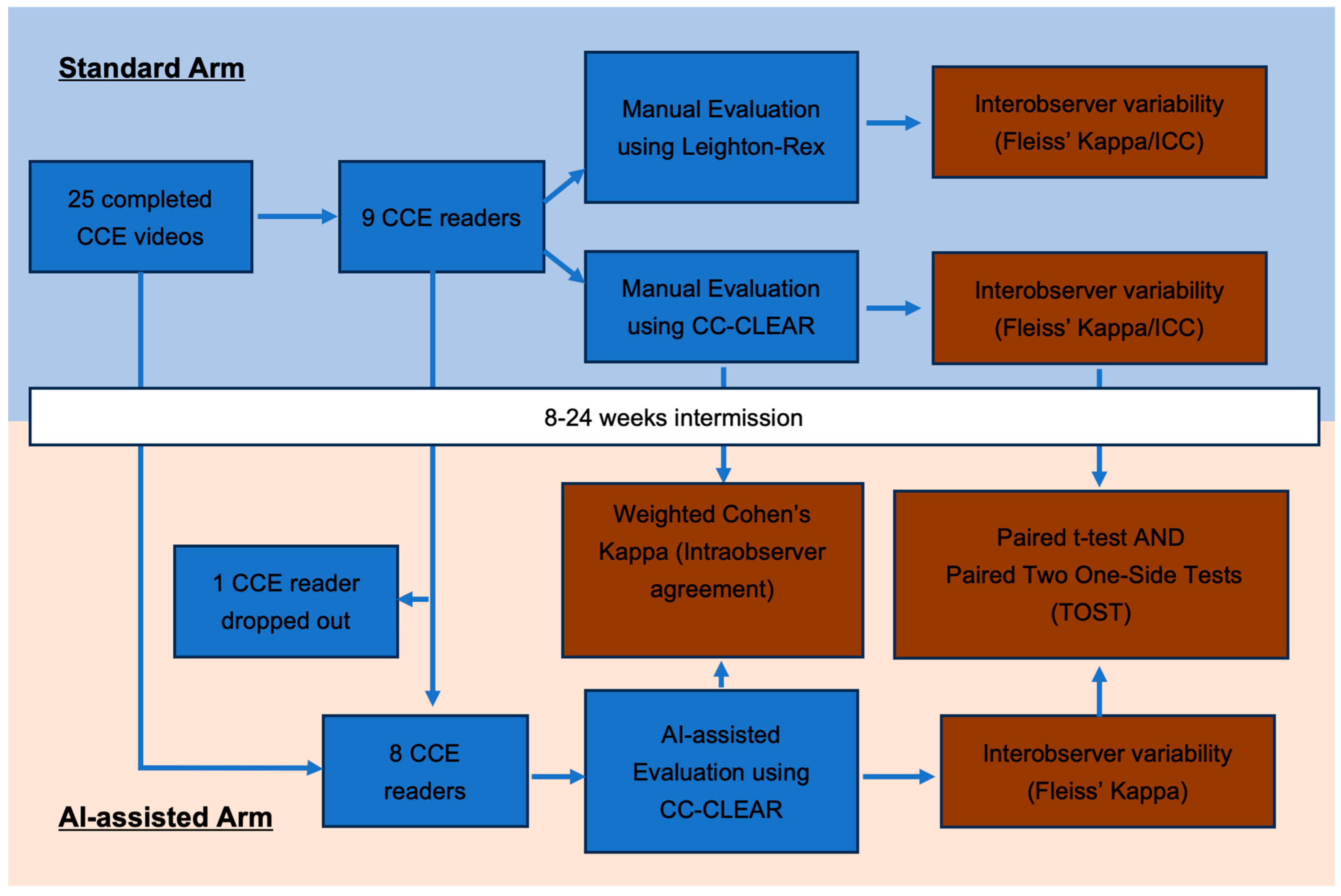 Considering these challenges, our sub-study aimed to address these gaps by integrating an AI-assisted tool for objective bowel preparation scoring in CCE. The primary objective was to evaluate interobserver variability in bowel cleansing assessment within the standard reading arm, using both the Leighton–Rex and CC-CLEAR scoring systems, among readers with differing levels of experience in CCE. The secondary objective was to evaluate both the interobserver and intraobserver variability by comparing standard and AI-assisted readings of the same CCE videos among the same readers, following a washout period.
