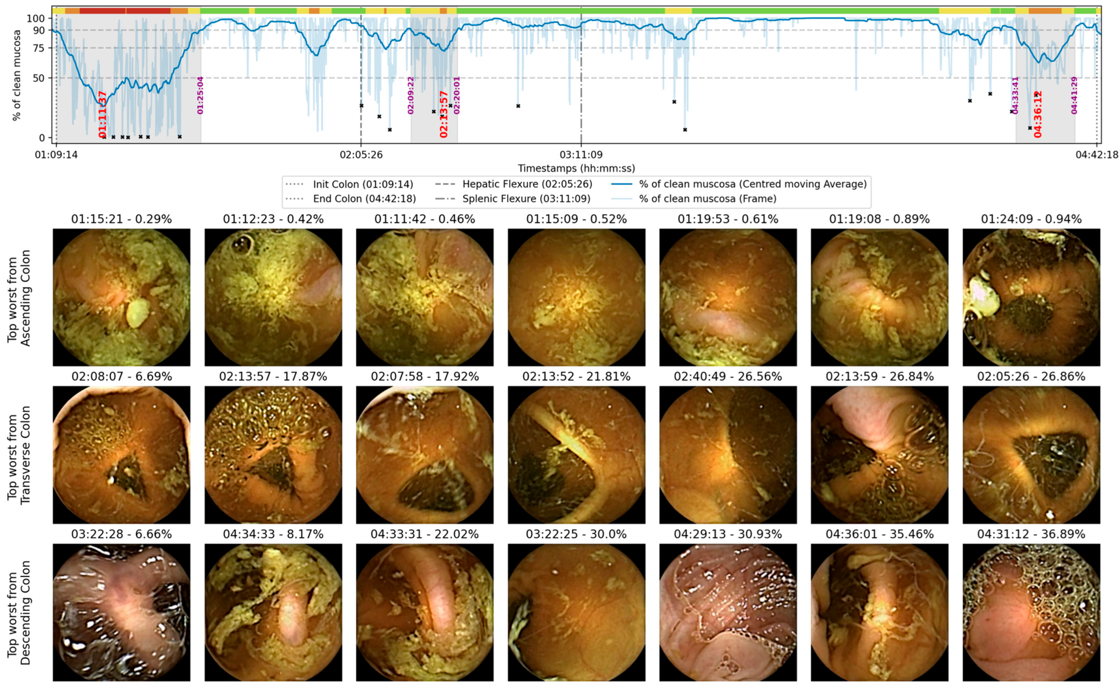 In addition to generating a timeline plot, the algorithm identifies and flags the six lowest bowel cleansing quality frames within each colonic segment, providing corresponding timestamps. These frames are selected according to the lowest predicted mucosal visibility, without independent validation of this approach. This fixed number was selected to optimise clinical usability by fitting clearly into a single-page report format, allowing high-resolution image display without cognitive overload. The approach follows a “worst-first” principle, whereby if the most poorly visualised frames in a colonic segment are deemed adequate, the remainder of the segment can reasonably be assumed adequate. Conversely, if the worst frames or sections are inadequate, the whole segment would be considered inadequate overall, prompting a follow-up colonoscopy regardless of the remainder. To maintain reader autonomy, flagged frames were accompanied by timestamps, allowing further review of adjacent video segments when needed. This strategy supports a semi-automated, human-in-the-loop workflow and represents a practical first step in validating AI-assisted cleansing evaluation in clinical settings.