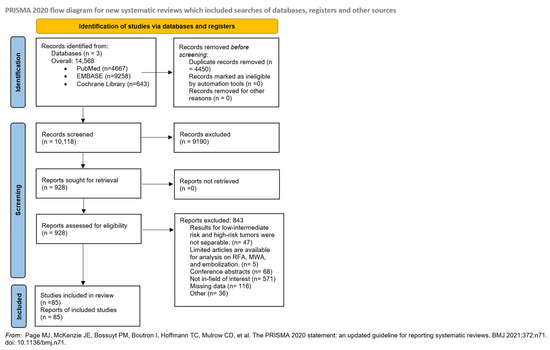 A total of 14,568 articles were identified, with 10,118 remaining after duplicate removal. After title and abstract selection, 928 articles were found, and 85 full-text articles were eligible for analysis. (Figure 1). Our meta-analysis and systematic review included 82 single-arm studies, 14 studies on IRE [27,28,29,30,31,32,33,34,35,36,37,38,39,40], 28 on cryoablation [41,42,43,44,45,46,47,48,49,50,51,52,53,54,55,56,57,58,59,60,61,62,63,64,65,66,67,68], 40 on HIFU [69,70,71,72,73,74,75,76,77,78,79,80,81,82,83,84,85,86,87,88,89,90,91,92,93,94,95,96,97,98,99,100,101,102,103,104,105,106,107,108], and three comparative articles investigating both cryoablation and HIFU [109,110,111]. The eligibility criteria for each study are detailed in Supplementary Table S3.
