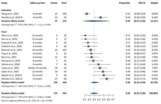The overall complication rate associated with IRE was 0.37 (95% CI: 0.27–0.48; PI: 0.11–0.74; I2 = 82%). Subgroup analysis yielded rates of 0.43 (95% CI: 0.15–0.77; PI: NA; I2 = 94%) for extended IRE and 0.35 (95% CI: 0.25–0.47; PI: 0.10–0.73; I2 = 77%) for FT, with no statistically significant difference between groups (p = 0.683). Although the incidence of major complications remained low in both groups, extended IRE demonstrated a rate of 0.02 (95% CI: 0.01–0.08; PI: NA; I2 = 23%), while focal IRE showed a rate of 0.03 (95% CI: 0.02–0.06; PI: 0.02–0.07; I2 = 0%).