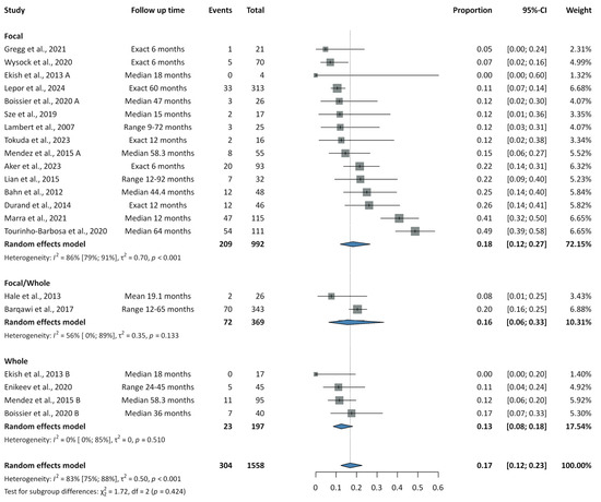 Forest plots illustrating recurrence rates following IRE are presented in Supplementary Figures S1–S3. In the extended subgroup at six months, two studies reported a recurrence rate of 0.26 (95% CI: 0.07–0.62; PI: NA; I2 = 93%). In the focal subgroup, eight studies yielded a six-month rate of 0.28 (95% CI: 0.19–0.40; PI: 0.07–0.66; I2 = 67%), and five studies reported a 12-month rate of 0.28 (95% CI: 0.15–0.46; PI: 0.03–0.85; I2 = 75%). The overall pooled recurrence rate across 14 studies was 0.29 (95% CI: 0.22–0.38; PI: 0.09–0.64; I2 = 74%). Subgroup analyses showed recurrence rates of 0.26 (95% CI: 0.07–0.62; PI: NA; I2 = 93%) for extended IRE and 0.30 (95% CI: 0.23–0.39; PI: 0.10–0.63; I2 = 68%) for focal IRE, with no significant difference between groups (p = 0.796). Among focal IRE studies, the pooled in-field recurrence rate was 0.14 (95% CI: 0.09–0.19; PI: 0.05–0.31; I2 = 36%), and the out-of-field recurrence rate was 0.15 (95% CI: 0.09–0.22; PI: 0.04–0.44; I2 = 57%). In- and out-of-field recurrence rates could not be assessed for extended IRE due to missing data.