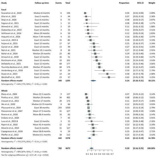 Summary forest plot of pooled recurrence rates for focal and whole-gland cryoablation [41,42,43,45,46,48,49,50,51,52,53,54,55,59,60,68,110,111].