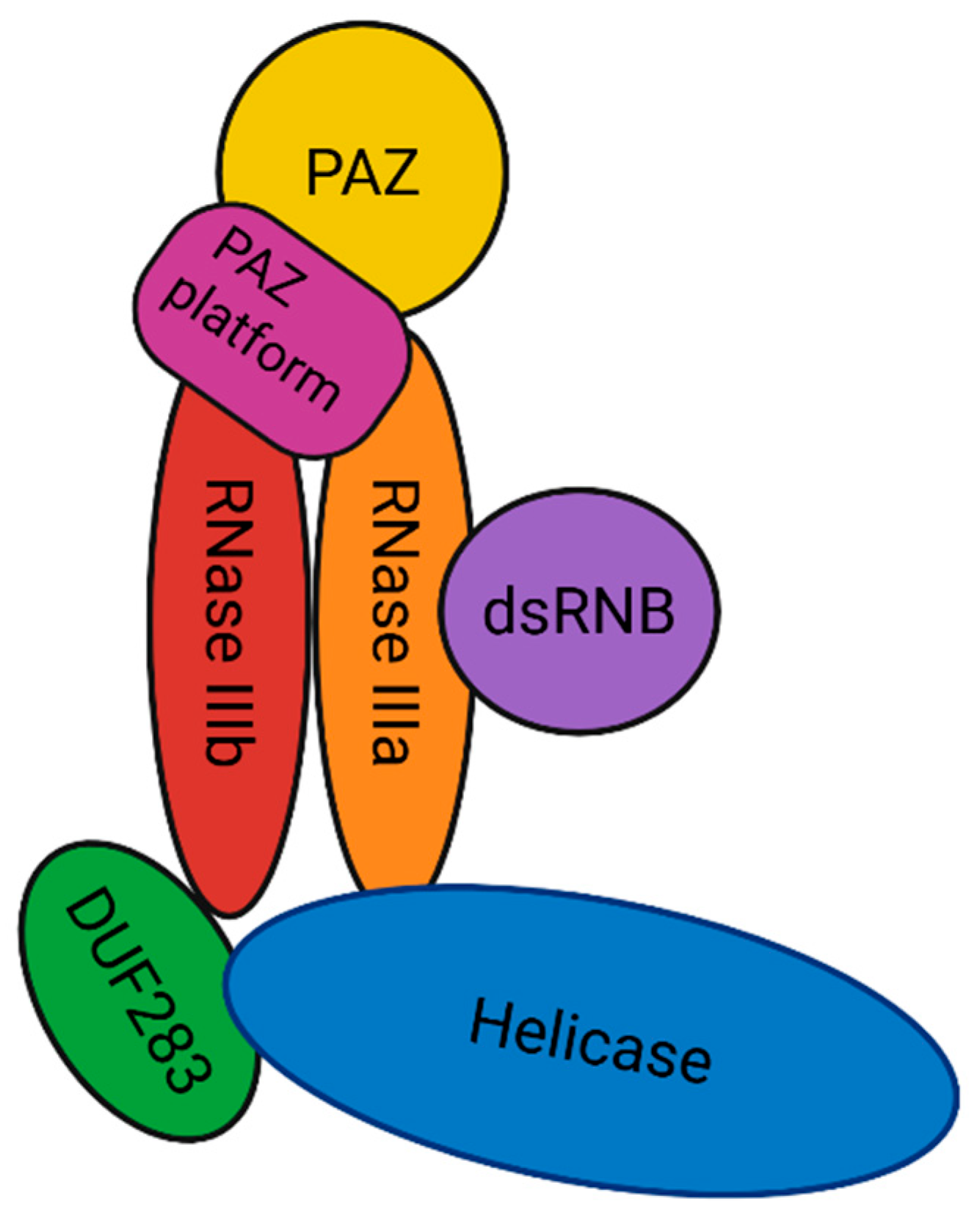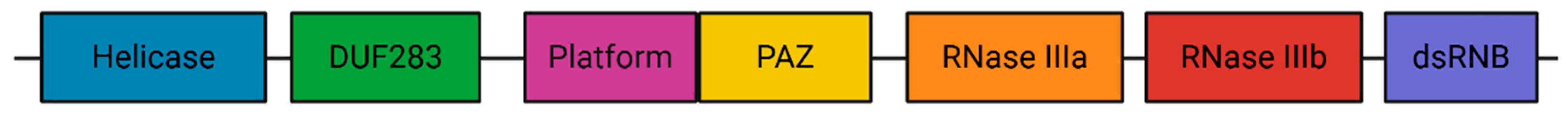 - Zapletal, D.; Kubicek, K.; Svoboda, P.; Stefl, R. Dicer Structure and Function: Conserved and Evolving Features. EMBO Rep. 2023, 24, e57215. [Google Scholar] [CrossRef]