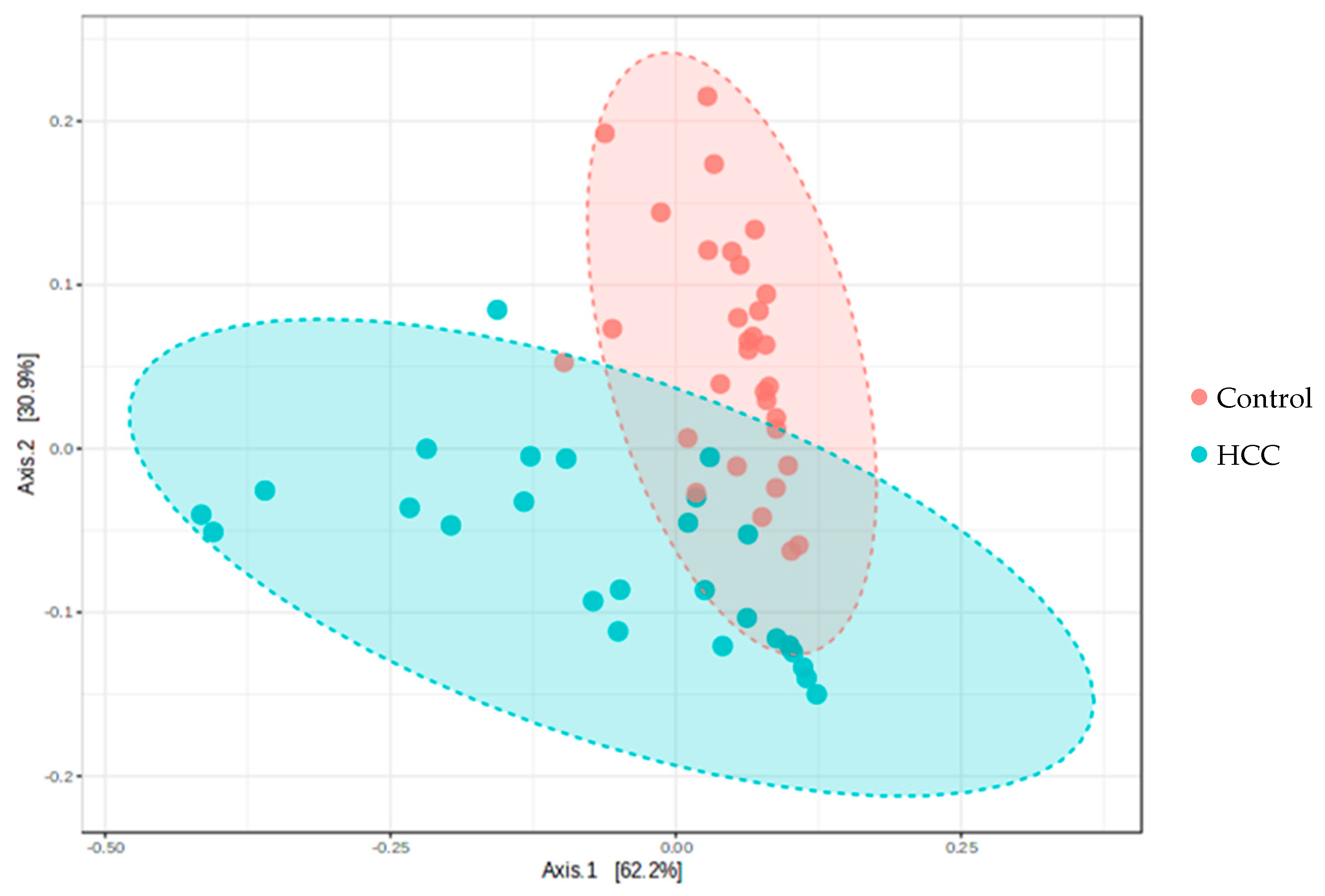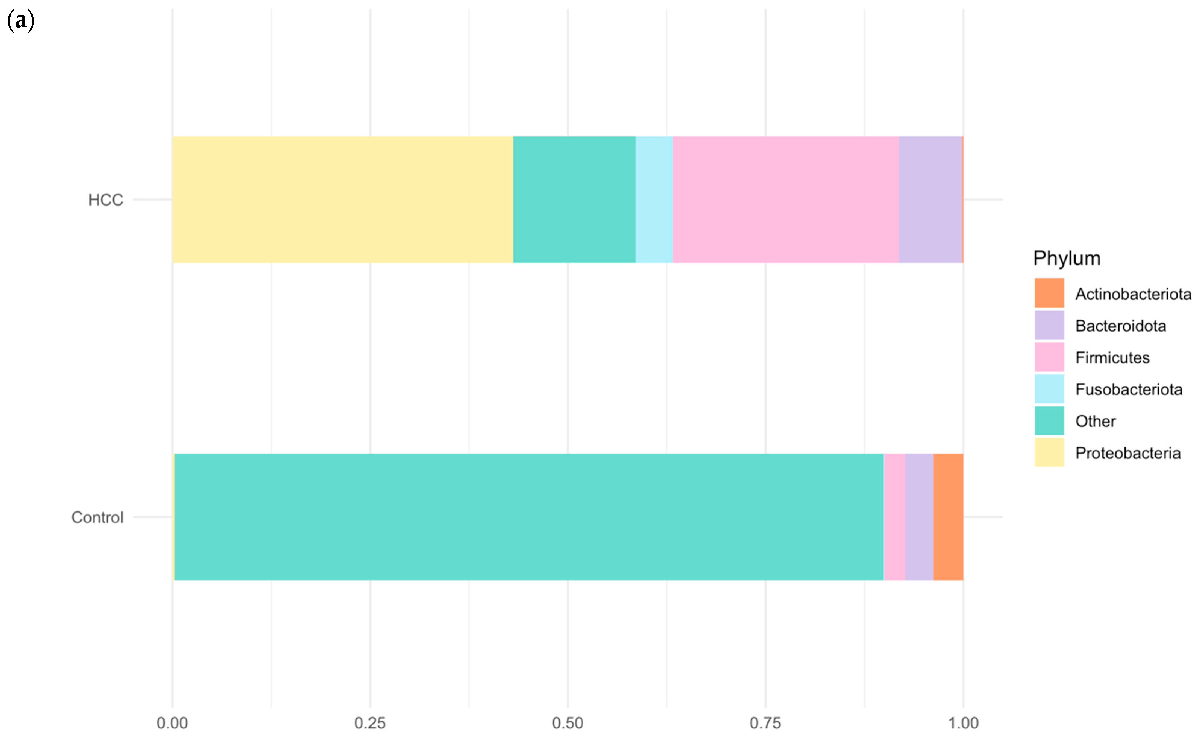 - Jinato, T.; Anuntakarun, S.; Satthawiwat, N.; Chuaypen, N.; Tangkijvanich, P. Distinct Alterations of Gut Microbiota between Viral- and Non-Viral-Related Hepatocellular Carcinoma. Appl. Microbiol. Biotechnol. 2024, 108, 34. [Google Scholar] [CrossRef]