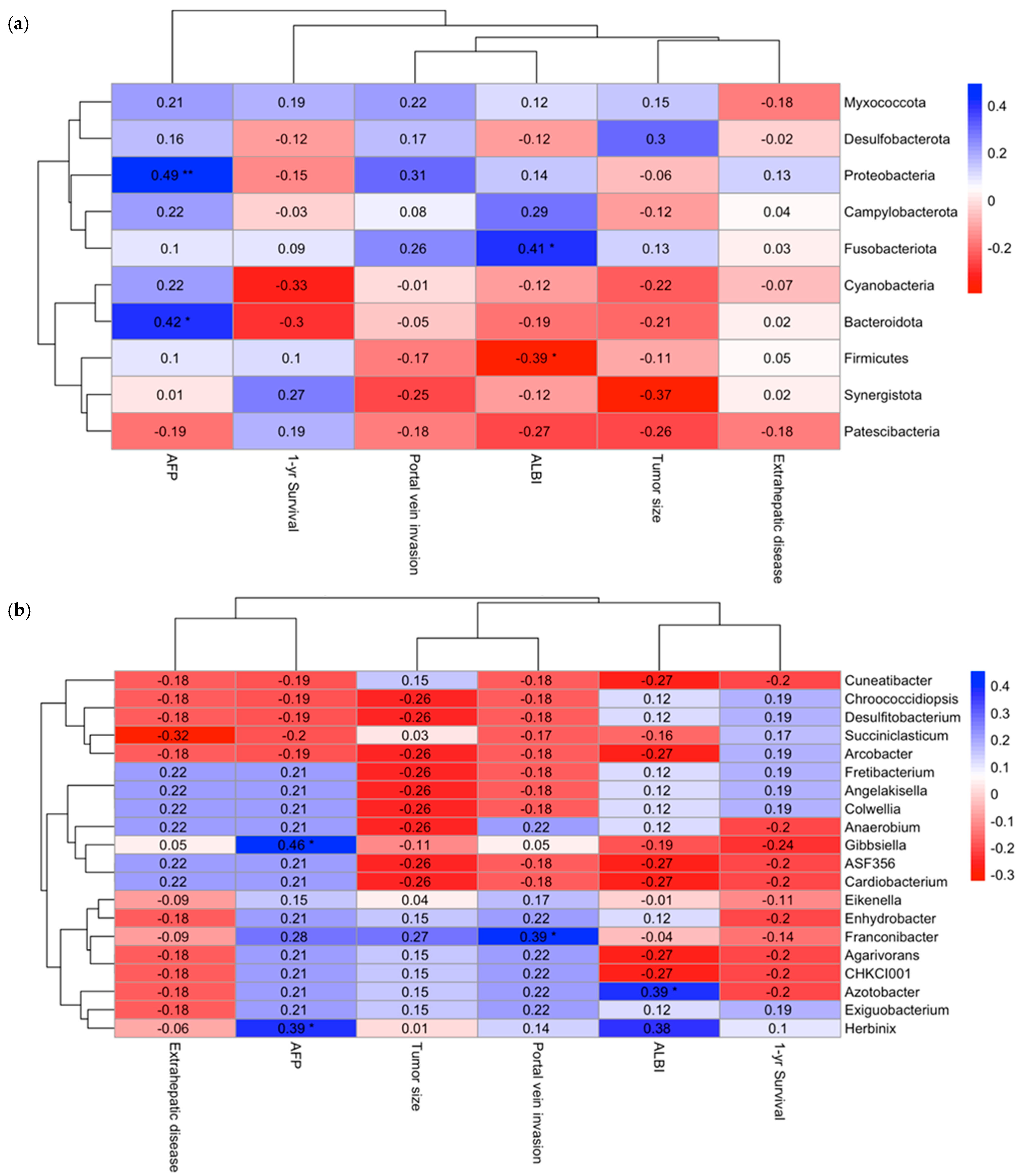 - Huo, R.; Chen, Y.; Li, J.; Xu, Q.; Guo, J.; Xu, H.; You, Y.; Zheng, C.; Chen, Y. Altered Gut Microbiota Composition and Its Potential Association in Patients with Advanced Hepatocellular Carcinoma. Curr. Oncol. 2023, 30, 1818–1830. [Google Scholar] [CrossRef]