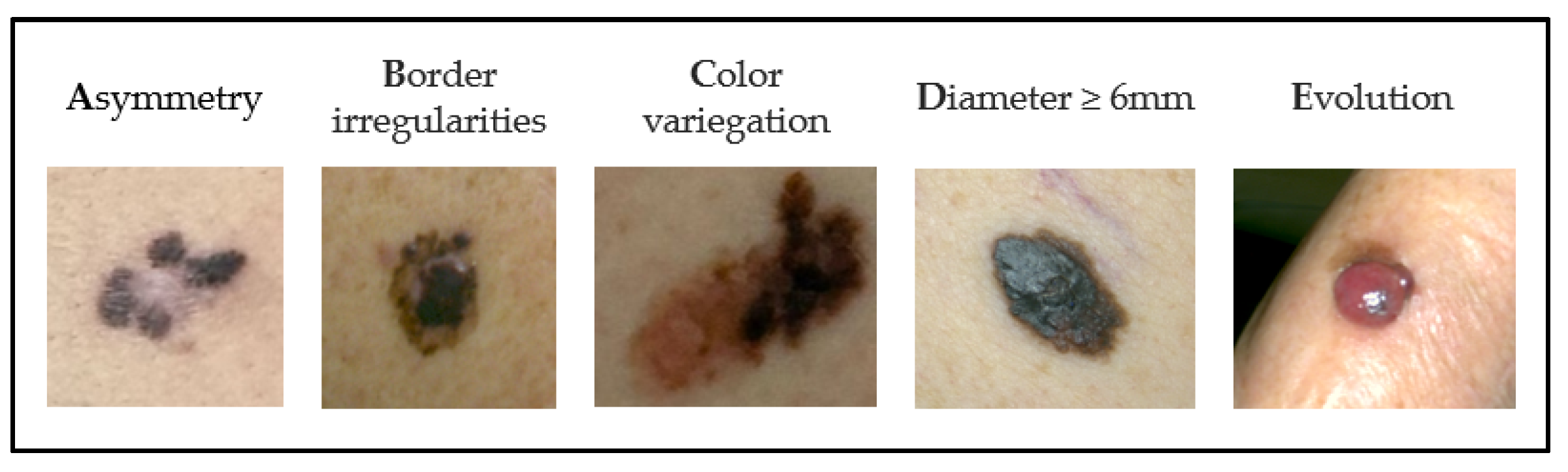 - Goldberg, M.S.; Doucette, J.T.; Lim, H.W.; Spencer, J.; Carucci, J.A.; Rigel, D.S. Risk factors for presumptive melanoma in skin cancer screening: American Academy of Dermatology National Melanoma/Skin Cancer Screening Program experience 2001–2005. J. Am. Acad. Dermatol. 2007, 57, 60–66. [Google Scholar] [CrossRef]