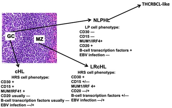 Transitional and Overlapping Features Among Hodgkin Lymphoma Subtypes Nodular lymphocyte-predominant Hodgkin lymphoma (NLPHL) can progress into a diffuse neoplasm enriched with T cells, morphologically and immunophenotypically resembling T-cell/histiocyte-rich large B-cell lymphoma (THCRLBCL). Lymphocyte-rich classic Hodgkin lymphoma (LRcHL) exhibits characteristics that lie between NLPHL and other classic Hodgkin lymphoma (cHL) forms. Notably, LRcHL tumour cells show partial retention of B-cell lineage features while simultaneously expressing cHL-associated markers, including CD30 and CD15, as well as transcription factors indicative of the B-cell program. Abbreviations: cHL, classic Hodgkin lymphoma; EBV, Epstein–Barr virus; GC, germinal center; HRS, Hodgkin and Reed–Sternberg; IRF4, interferon regulatory factor 4; LD, lymphocyte-depleted; LP, lymphocyte-predominant; LRcHL, lymphocyte-rich classic Hodgkin lymphoma; MZ, mantle zone; NLPHL, nodular lymphocyte-predominant Hodgkin lymphoma; PAX5, paired box gene 5; MC, mixed cellularity; MUM1, melanoma-associated antigen (mutated) 1; NS, nodular sclerosis; THCRLBCL, T-cell/histiocyte-rich large B-cell lymphoma.