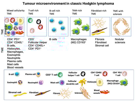 Although the TME in cHL displays a variable cellularity according to cHL subtypes, the TME frequently consists of a mixed, reactive infiltrate with B cells and T cells, neutrophils, histiocytes, plasma cells and mast cells. However, the composition of the TME can also be rich in T cells or B cells, or tumour associated macrophages (TAM) or fibroblasts associated with or not with band of sclerosis [55] (Figure 4).