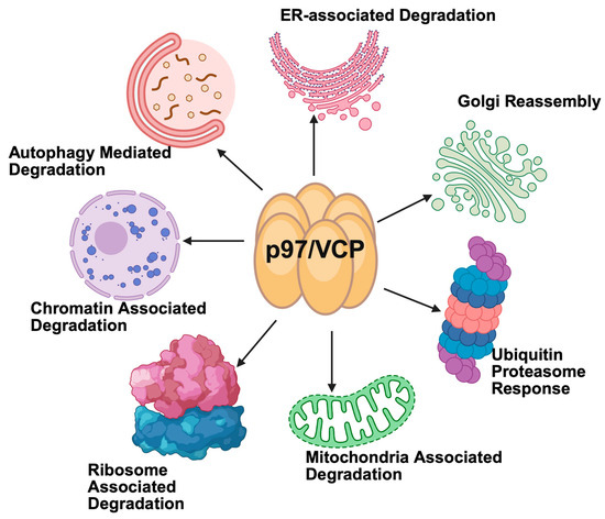 Aggrephagy is a specialized form of autophagy responsible for the clearance of protein aggregates that serves to maintain cellular homeostasis under stress conditions. p97 has emerged as a key regulator of this process. Recent studies demonstrate that p97 overexpression reduces the accumulation of ubiquitinated proteins in autophagy-deficient cells overexpressing p62 [72,73]. This suggests that p97 and p62 may compete for binding to ubiquitinated substrates. This competitive interaction positions p97 as a regulatory switch that influences the selection and clearance of aggregated proteins.