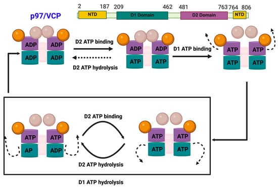 p97 has four structural domains: a conserved N-terminal domain, two AAA ATPase domains (D1 and D2), and a C-terminal tail, all of which are essential for its function (Figure 2) [17,18,19,20,21]. The D1 and D2 domains are stacked in a head-to-tail manner and connect with a short polypeptide linker. The D1 domain primarily facilitates hexamer formation, whereas the D2 domain performs most of the ATPase activity [22]. The N-terminal domain is connected to the D1 domain by another short linker and is important for substrate recognition and its interaction with other cofactors [23]. The C-terminal tail of p97 has been reported to be involved in nuclear localization through interactions with other proteins [24,25]. Fundamentally, p97 functions as an interaction hub and at least 30 different cofactors have been shown to modulate p97-mediated processes [26,27,28,29].