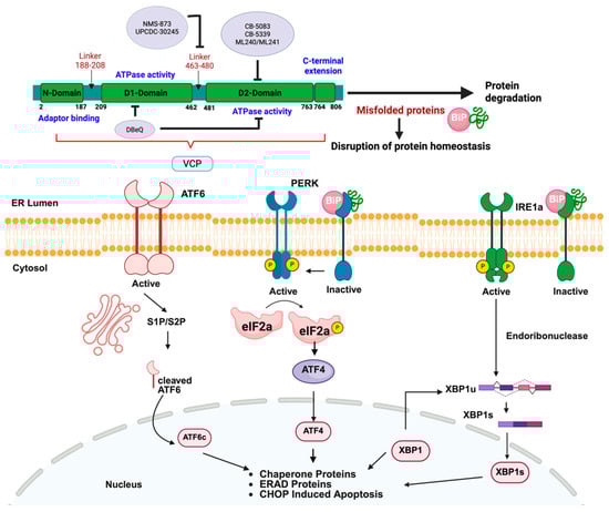 Given its central role in multiple cellular processes including protein homeostasis, chromatin remodeling, and the DNA damage response, p97 has emerged as a compelling therapeutic target. The dysregulation of p97 activity is implicated in a variety of diseases, including cancer, neurodegeneration, and viral infection [7,97]. Consequently, the development of small-molecule p97 inhibitors has become an active area of research. p97 inhibitors are designed to disrupt the ATPase activity or cofactor interactions of p97 in a manner that interferes with its roles in protein homeostasis and other cellular processes (Figure 3). Since many cancer cells are heavily reliant on the UPR and ERAD pathways due to high protein synthesis rates and possibly aneuploidy, the inhibition of p97 induces irresolvable proteotoxic stress-mediated cell death. Therefore, p97 is an actionable vulnerability in cancer cells, particularly in those that exhibit constitutive levels of ER stress, such as MM. It is also notable that p97 inhibitors have been reported to induce higher UPR activation than bortezomib, indicating that they may display differential anticancer efficacy compared to proteasome inhibitors [9]. Taken together, p97 inhibitors represent a promising class of anticancer agents with clinical potential that warrants further investigation.