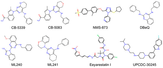 ML240 and ML241 are two additional small molecule inhibitors developed to target the ATPase activity of p97. These compounds are also ATP-competitive and selectively bind to the D2 domain of p97. Both ML240 and ML241 effectively inhibit ERAD, but only ML240 has been shown to inhibit autophagy and induce apoptosis. In contrast, ML241 exhibits milder cellular effects and does not induce apoptosis to the same extent [12]. The differential activity between these two inhibitors may reflect the importance of dual pathway inhibition in triggering cell death. Specifically, the induction of apoptosis may require the simultaneous disruption of both autophagy and proteasome-dependent degradation, which is achieved more effectively by ML240 [12,101]. These findings suggest that the degree and specificity of p97 inhibition can result in distinct cellular outcomes and provide a rationale for further structure−activity relationship (SAR) optimization.