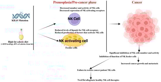 Genetic mutations or specific gene knockouts can result in preneoplasia or cancer [41]. Studies reveal that a high-fat, high-calorie diet (HFCD) given to healthy mice and mice with pancreatic KRAS mutations significantly reduces NK cell numbers and functions during the preneoplastic stage of pancreatic cancer [42,43]. Cytotoxic activity and cytokine secretion were impaired in KRAS-mutant mice on a control diet (CD), HFCD-fed mice, and healthy mice on HFCD [43]. Furthermore, feeder cells from KRAS-mutated mice on HFCD showed notably lower levels of MHC class I inhibitory ligands and RAE1-delta-activating ligands, essential for NK cell signaling [43]. This reduction was more significant in KRAS-mutated mice on HFCD compared to those on a CD, with WT mice on a CD showing the highest ligand levels [43]. Pancreatic intraepithelial neoplasia (PanIN) refers to a small, non-invasive precancerous lesion found in the small ducts of the pancreas. These lesions involve abnormal epithelial cell changes and are considered the main precursors to pancreatic ductal adenocarcinoma (PDAC), a highly aggressive and deadly type of pancreatic cancer. The decreased presence of MHC class I and RAE1-delta on feeder cells correlates with PanINs in KRAS-mutated mice, suggesting a link between reduced surface receptors on feeder cells, impaired NK cell activity, and PanIN development [42,43]. These findings highlight that impaired NK cell function, influenced by genetic and environmental factors during the pre-malignant phase, may play a crucial role in the onset and progression of pancreatic cancer (Figure 1).