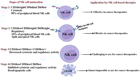 To understand the diverse roles of NK cells in contexts such as the tumor microenvironment or during infections, it is crucial to explore their regulation and mechanisms. Studies have identified four stages of NK cell maturation in humans based on CD16, CD56, and CD69 surface receptors [67,115] (Figure 2). Stage 1 features CD16brightCD56dimCD69low NK cells, which make up about 90% of peripheral blood NK cells and are crucial for targeting and destroying stem-like cancers. Stage 2 includes CD16lowCD56brightCD69bright NK cells, which are less cytotoxic or anergized, aiding in regulating other cell functions and promoting tumor cell differentiation through secreted factors. In Stage 3, NK cells may lose cytotoxicity or the ability to produce IFN-γ as they mature further. Stage 4 marks the apoptosis of NK cells (Figure 2).