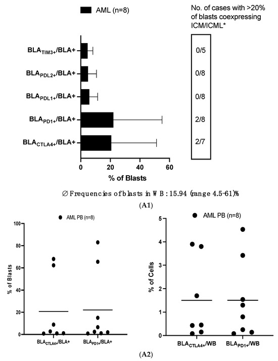 3.1.1. High Frequencies of Uncultured AML-Blasts Co-Express ICM (CTLA4 and PD1)