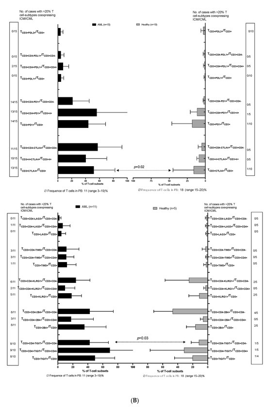 We found significantly more CTLA4-expressing TCD3+ cells in AML compared to healthy donors’ T-cells, with 13 of the 15 patients’ samples presenting with >20% of TCD3+CTLA4+/TCD3+. Furthermore, 8 out of 10 patients demonstrated (significantly) elevated frequencies of TCD3+CD4− cells co-expressing TIGIT (TCD3+CD4−TIGIT+/TCD3+CD4−) compared to healthy samples (Figure 1B, lower part).