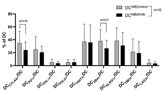 Following Kit M (vs. without) treatment of WB, frequencies of ICM/ICML (esp. CTLA4, 2B4) expressing DC were (borderline significantly) downregulated (e.g., %DCCTLA4+/DC: Kit M: 24.06 ± 12.33 vs. control 34.82 ± 18.17, p = 0.06, Figure 2). Analogously, we quantified ICM/ICML expressing DCleu subtypes. Evaluation of ICM/ICML-expressing DCleu after Kit M treatment was infeasible due to low blast/DCleu counts.