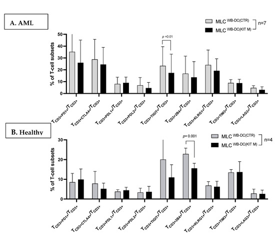 Frequencies of ICM-expressing TCD3+ cells (e.g., TCD3+CTLA4+/TCD3+, TCD3+PD1+/TCD3+, TCD3+TIGIT+/TCD3+) were significantly downregulated after MLC with Kit M-pretreated vs. not pretreated AML patients’ and healthy donors’ samples (Figure 3).