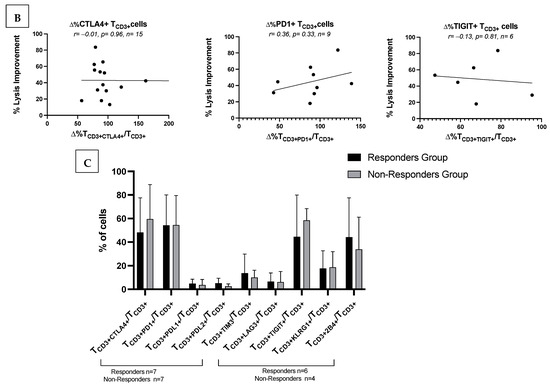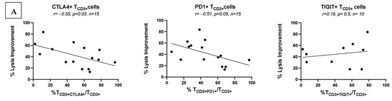 In correlative univariable analyses (t-test), in uncultured patients’ WB, we observed significant correlations between low frequencies of uncultured T-cells co-expressing ICM and ex vivo achieved blast lysis after MLC (e.g.: TCD3+CTLA4+/TCD3+ (p = 0.03), TCD3+PD1+/TCD3+ (p = 0.05), TCD3+2B4+/TCD3+ (p = 0.02), TCD3+TIM3+/TCD3+ (p = 0.08) (Figure 4A and Supplementary Figure S6A). Furthermore, patients with lower frequencies of TCD3+CTLA4+/TCD3+ and TCD3+TIGIT+/TCD3+ showed a better clinical response to salvage treatment (Figure 4C).