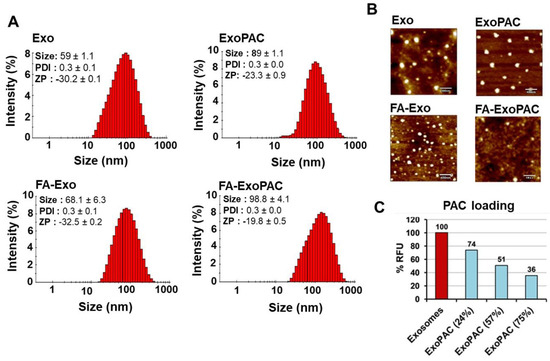 Characterization and drug loading of colostrum-derived exosomes. Size, polydispersity index (PDI), and zeta potential (ZP) of exosomes, FA-Exo, ExoPAC and FA-ExoPAC, analyzed by Zetasizer. Data represent mean ± SD from three preparations (A). Analysis of exosomes and ExoPAC by atomic force microscopy (AFM) after diluting with deionized water up to 10 μg/mL. For measurement, samples were placed on a silica wafer and air-dried for 30 min. AFM in tapping mode and aluminum-coated silicon probes were used for imaging (B). The bar diagram shows the quenching of autofluorescence from the exosomes following PAC loading (C). Higher quenching of fluorescence in the presence of higher drug load suggests a hydrophobic interaction of drug with exosomal proteins.
