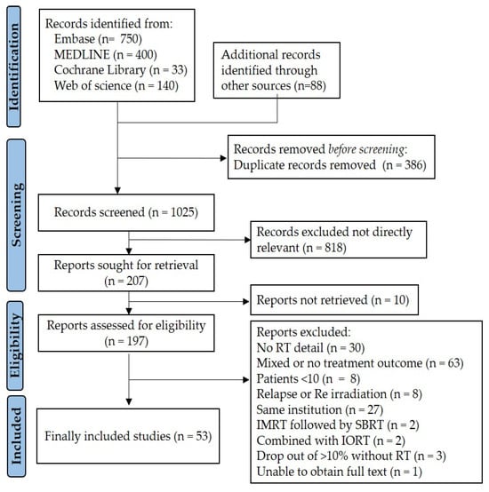 Initially, a total of 1411 studies, 1323 studies from four databases and 88 studies from additional sources, were identified. After multiple screening, 197 studies were selected for a full-text review and 144 were excluded for the following reason: (1) no treatment outcomes (n = 63); (2) no details on RT techniques (n = 30); (3) overlapping patients from same institution (n = 27); and so on. The PRISMA flow diagram, presented in Figure 1, outlines the detailed study selection process. Finally, 53 studies conducted between 2004 and 2024 met the inclusion criteria [22,23,24,25,26,27,28,29,30,31,32,33,34,35,36,37,38,39,40,41,42,43,44,45,46,47,48,49,50,51,52,53,54,55,56,57,58,59,60,61,62,63,64,65,66,67,68,69,70,71,72,73,74]. Among these, 2 studies separately analyzed the outcomes of patients with LAPC who received definitive RT into two treatment groups based on RT techniques, which were classified into distinct cohorts [23,33]. Ultimately, 55 cohorts compromising 2548 patients with unresectable LAPC were included for this study.