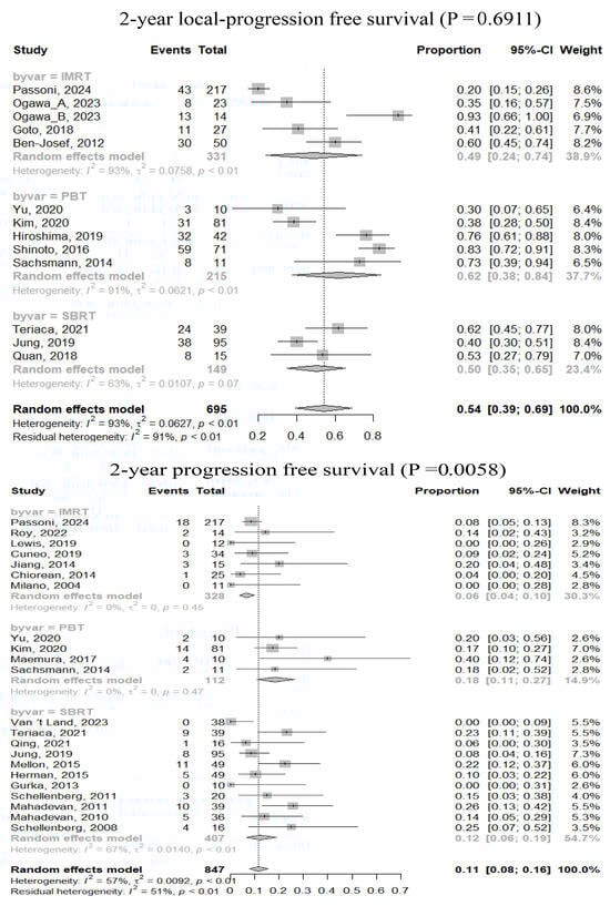 Using random effects analysis, pooled rates for 2-year LPFS, PFS, and OS were 54% (95% confidence interval [CI], 39–69%), 11% (95% CI, 8–16%), and 29% (95% CI, 25–34%), respectively (Figure 2). Subgroup comparisons revealed no significant differences in treatment outcomes among RT techniques (Table 3, Supplementary Table S5). The duration of ICT was the only significant factor affecting OS: a median ICT duration of >1 month was associated with improved 1- and 2-year OS rates. Additionally, delivering a higher RT dose (mBED > 60 Gy10) was significantly associated with improved 3-year OS rate.