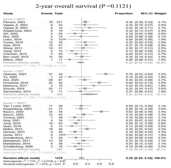 Globally, the practice of RT is transitioning from 3DCRT to modern RT techniques, including IMRT, SBRT, and PBT, across all cancers, but there is insufficient evidence whether these advanced RT techniques would translate into better treatment outcomes [16,17]. To address this gap, we conducted a comprehensive evaluation of the role of RT in LAPC management in the modern era. A systematic review and meta-analysis were performed to assess overall treatment outcomes of modern RT techniques for LAPC and compare the results of IMRT, SBRT, and PBT.