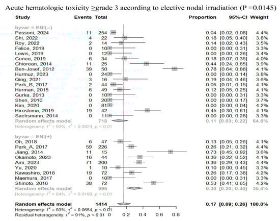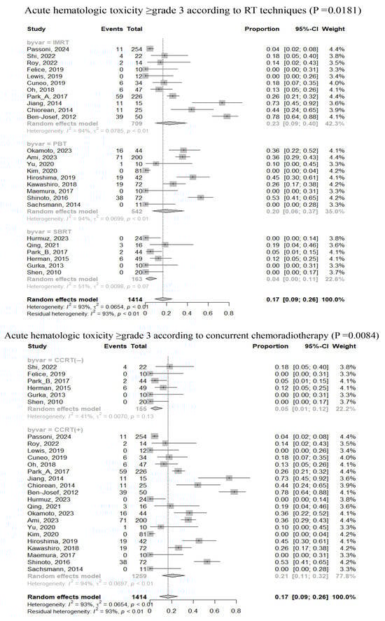 Details regarding the overall incidence of severe toxicities during and after RT are presented in Supplementary Table S6. Acute HT rates ≥ grade 3 during RT ranged from 0 to 78% of the patients. Acute and late GIT rates ≥ grade 3 were observed in 0–14% and 0–50% of patients, respectively. The pooled rate of acute HT ≥ grade 3 was 17% (95% CI, 9–26%), respectively. Subgroup analyses indicated that RT techniques, CCRT, and ENI were significant factors associated with acute HT (Figure 3). The pooled rates of acute and late GIT ≥ grade 3 were 0% (95% CI, 0–1%) and 2% (95% CI, 1–4%), respectively.