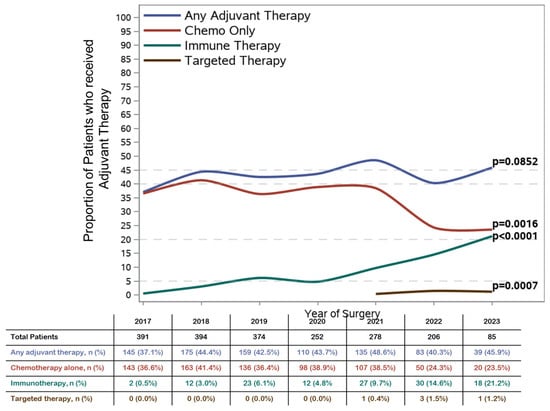 Trends in the use of adjuvant therapy were evaluated over the study time period from 2017 to 2023. For this analysis, patients were grouped into three categories stratified by the type of adjuvant therapy they received: (1) adjuvant chemotherapy alone: patients who underwent adjuvant chemotherapy alone, (2) adjuvant immunotherapy: patients who underwent adjuvant immunotherapy with or without chemotherapy, (3) adjuvant targeted therapy: patients who underwent adjuvant targeted therapy with or without chemotherapy.