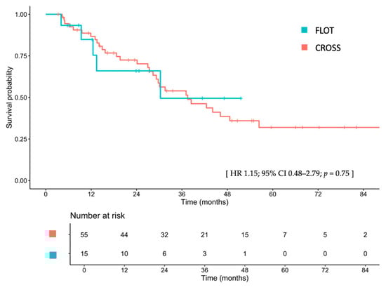 Overall survival between patients treated with FLOT and those treated with CROSS. FLOT, fluorouracil, leucovorin, oxaliplatin, and docetaxel; CROSS, chemoradiotherapy for esophageal cancer followed by surgery study; CI, confidence interval; HR, hazard ratio.