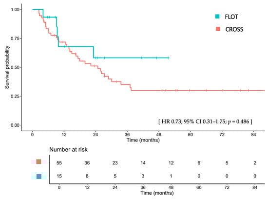 Recurrent disease was observed in 4 patients (26.7%) in the FLOT group and 27 patients (49.1%) in the CROSS group. Local recurrence was more frequent in patients treated with the FLOT regimen than in those treated with the CROSS protocol (50.0% vs. 22.2%, Table S2). Among the patients with recurrent disease, 75.0% and 55.5% in the FLOT and CROSS groups, respectively, received palliative systemic chemotherapy. The details of the treatment regimens are provided in Table S2.